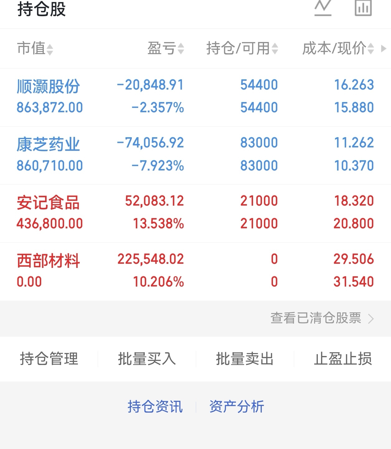 股友们大家早上好,今天又是开心的一天,$西部材料(SZ002149)$ 昨天是个好的买点!今天拉高9个点的位置出了!$顺灏股份(SZ002565)$ 今天低开低走但承接还不错,考虑继续持有!$安记食品(SH603696)$ 今天跳空高开好出货,但城哥没有那么做,继续留着剩下的!康芝药业午后打算加仓!继续格局!