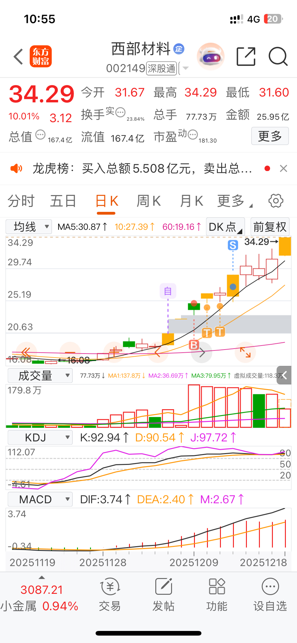 $西部材料(SZ002149)$ 好消息没亏赚8k 坏消息没想到这么强出去买的商超 吃一个跌停一个涨停 早知道在这里老老实实不懂了