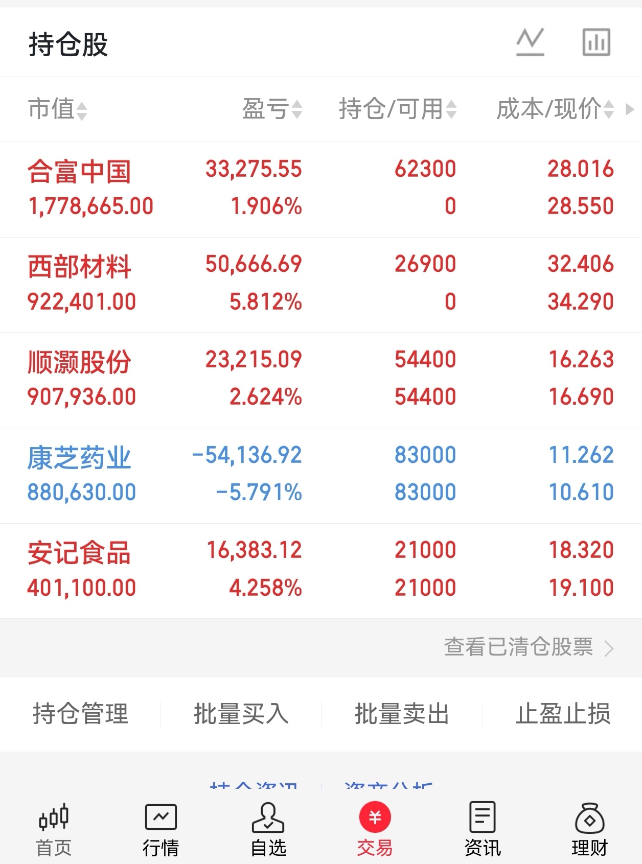 各位股友们早上好!今天的盘面还不错!下面说说我的持仓:$西部材料(SZ002149)$ 昨天卖了,今天又接了回来!$合富中国(SH603122)$ 今天早上以28.01进去,等表现!$顺灏股份(SZ002565)$ 昨天我也说了承接还不错,今天直接反包涨停板!康芝药业目前走势来看,可以格局一下打算做做T