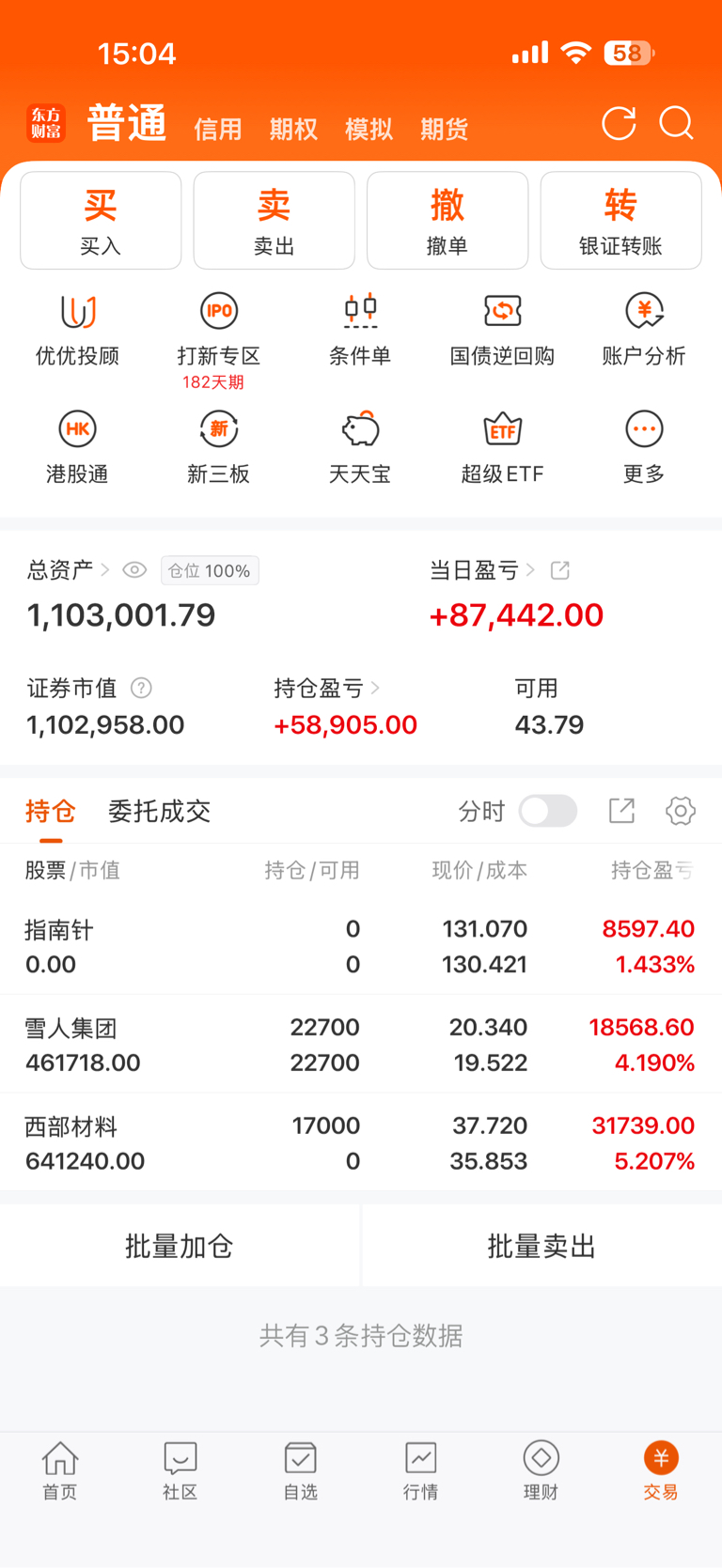 昨天所有老铁不看好的雪人,今天再次打了你们的脸,开盘直接超预期超大封单,虽然一度炸板,在我看来是洗不坚定筹码,后来还是封住了。指南针昨天本该走的,不过今天拉升给了出逃的机会,反手看到西部材料还有很大机会,就直接去了。今天可谓是舒服满满,开心过个周末吧。