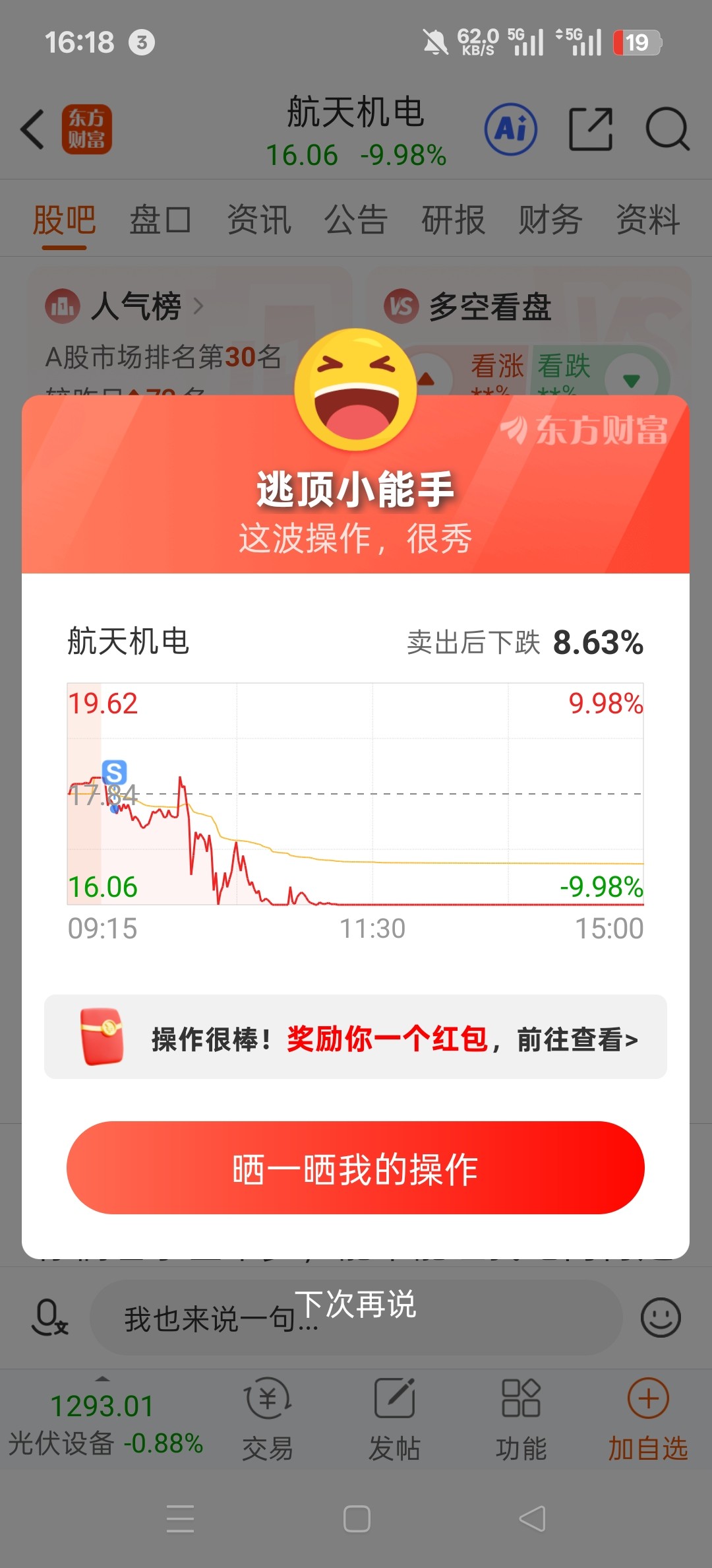 胆子大的格局一下,五日线不破不罢休,主要还是可以博弈一下10日线反弹,行情结束的标志性还是巨量阴或者平潭发展那种的天地面。