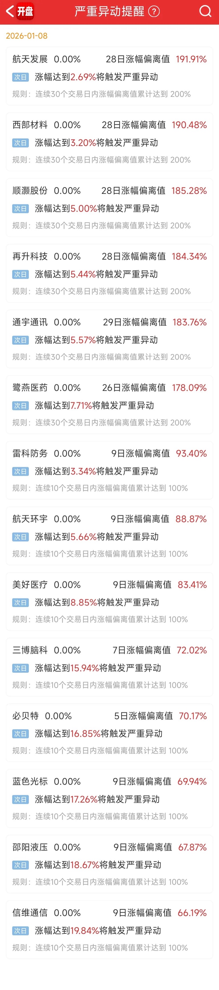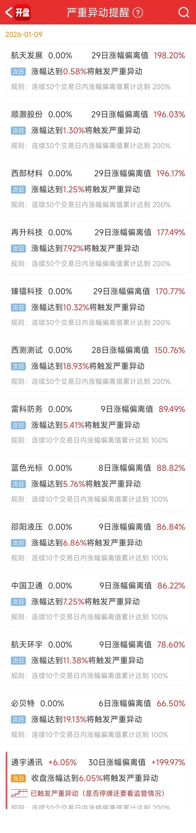 现在2565也有可能进监管,就差2个点,航天发展也是差2个点,通宇通讯在监管边缘,不清楚能不能进监管,那个邵阳也是监管附近,,西部材料和再升今天是放弃了试监管。$顺灏股份(SZ002565)$$通宇通讯(SZ002792)$$航天发展(SZ000547)$