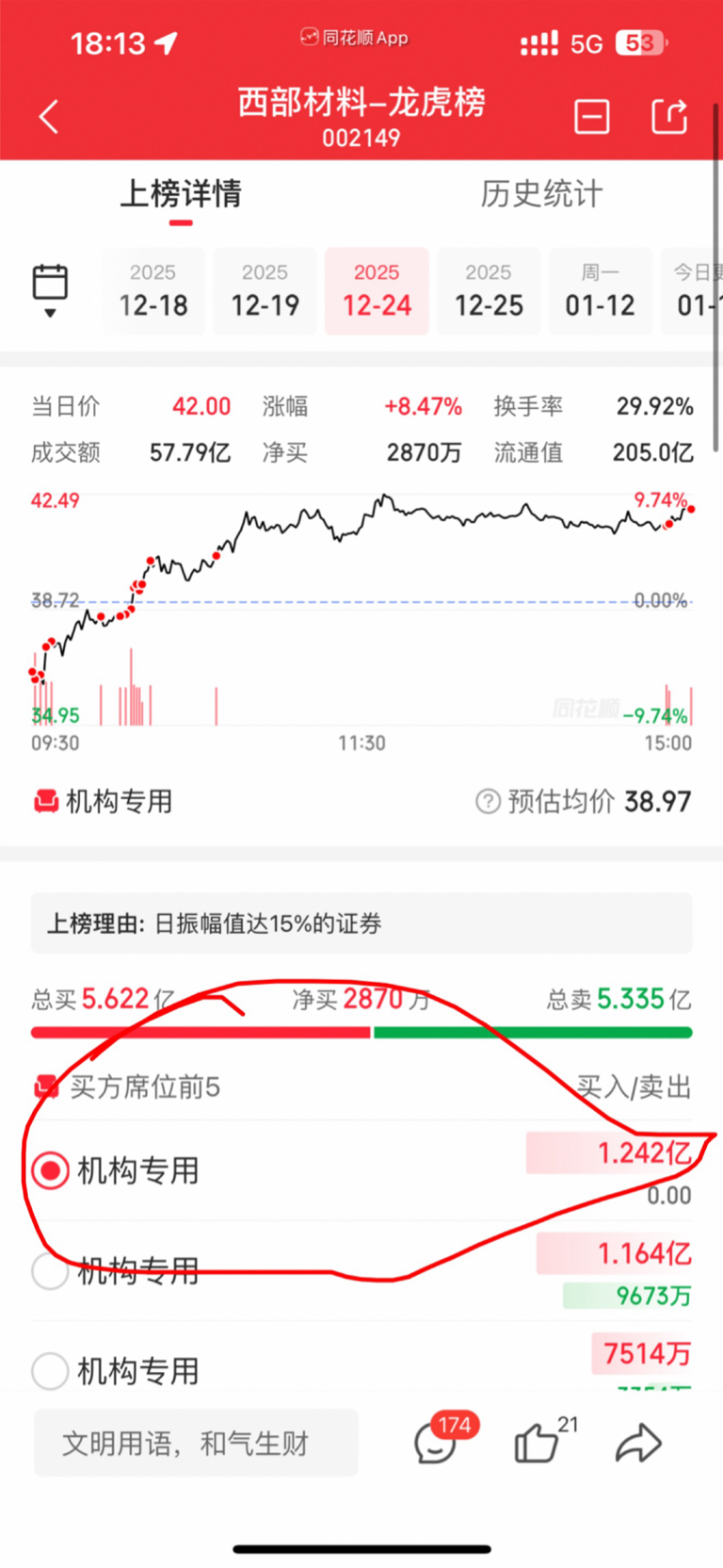 $西部材料(SZ002149)$ 24号机构建仓,今天有机构吸筹,异动票里面西部算是最好看的一只了,价41.8附近,大胆吸,比机构高不了多少的建仓成本