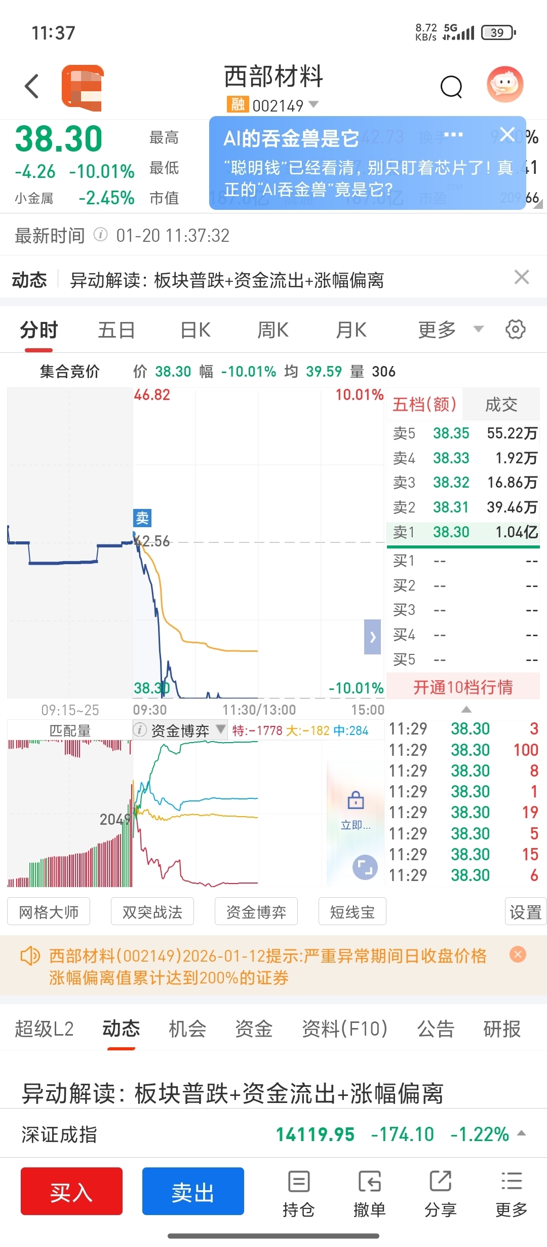 $西部材料(SZ002149)$ 你是真不给力啊,昨天才夸你是最抗跌的,没想到今天来了个大的!看样子航空股彻底没戏了,上面套了太多散户了,现在还在慢慢出货,年前航天票大概率被抛弃了!