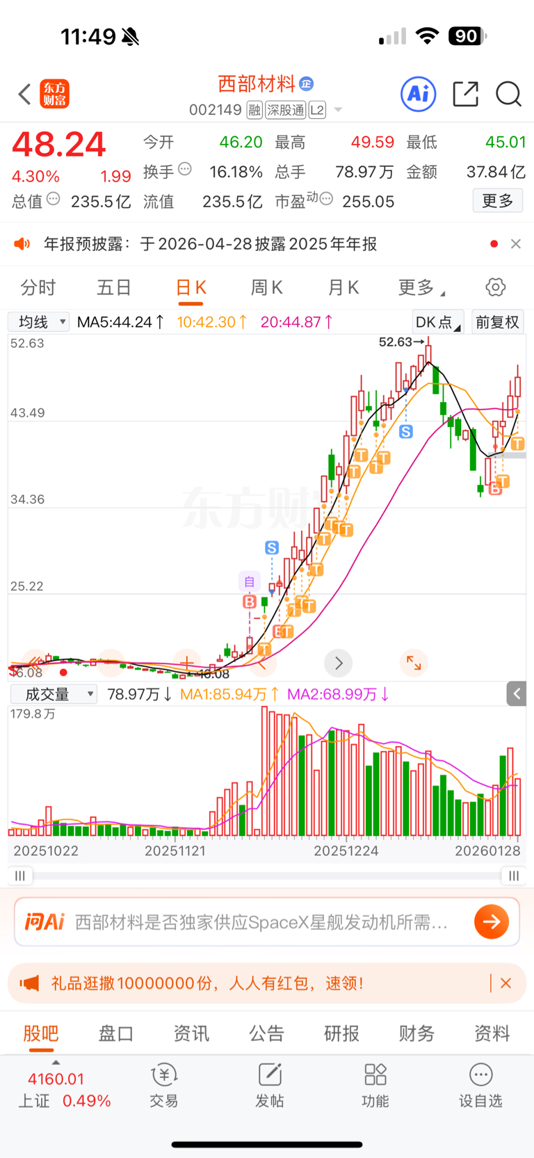 $西部材料(SZ002149)$ 今日收盘48 明天收盘52.8破前高 起主升浪走二波