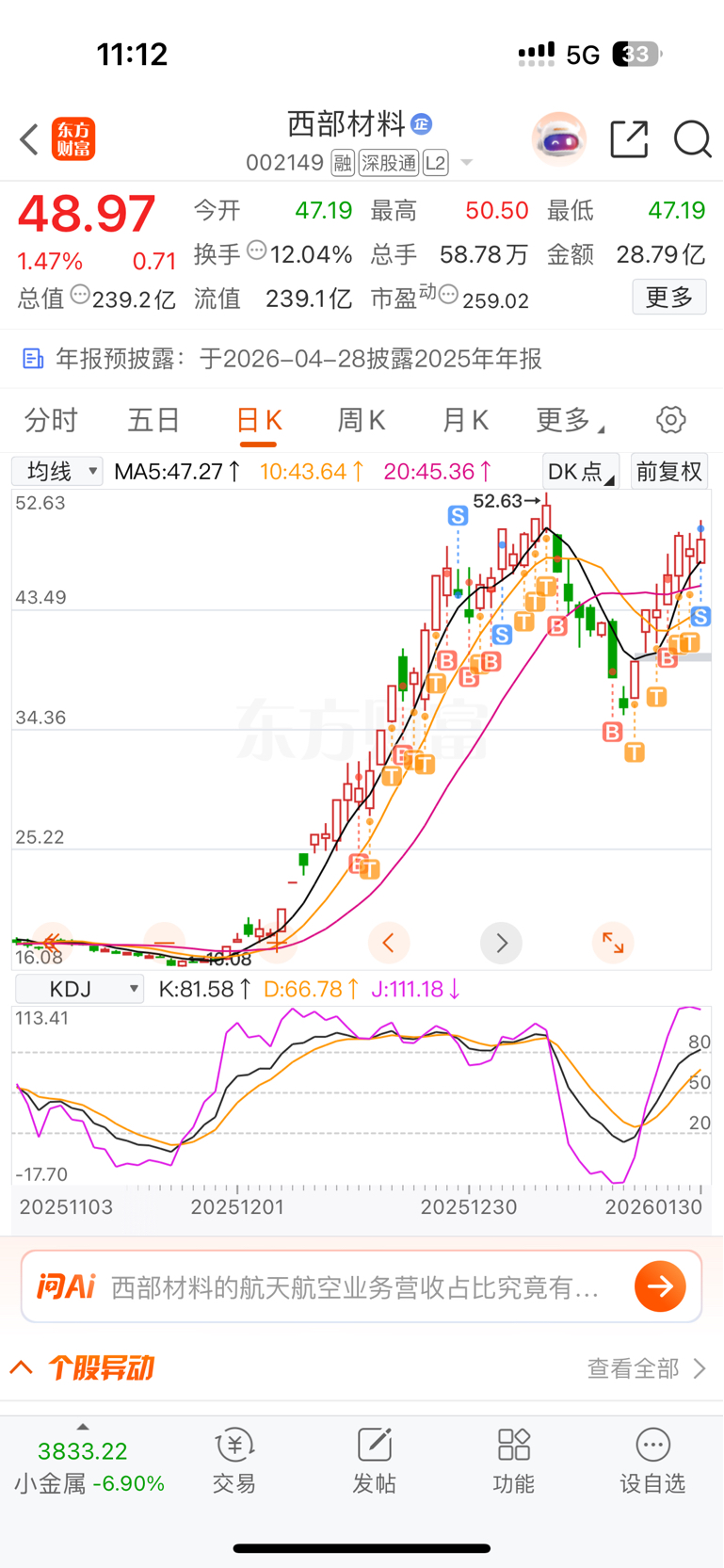 $西部材料(SZ002149)$ 经过上一次教训,上一次利润3w,没走,全给回去,这次先跑了,利润4w,下周观望再回,这是一只好股