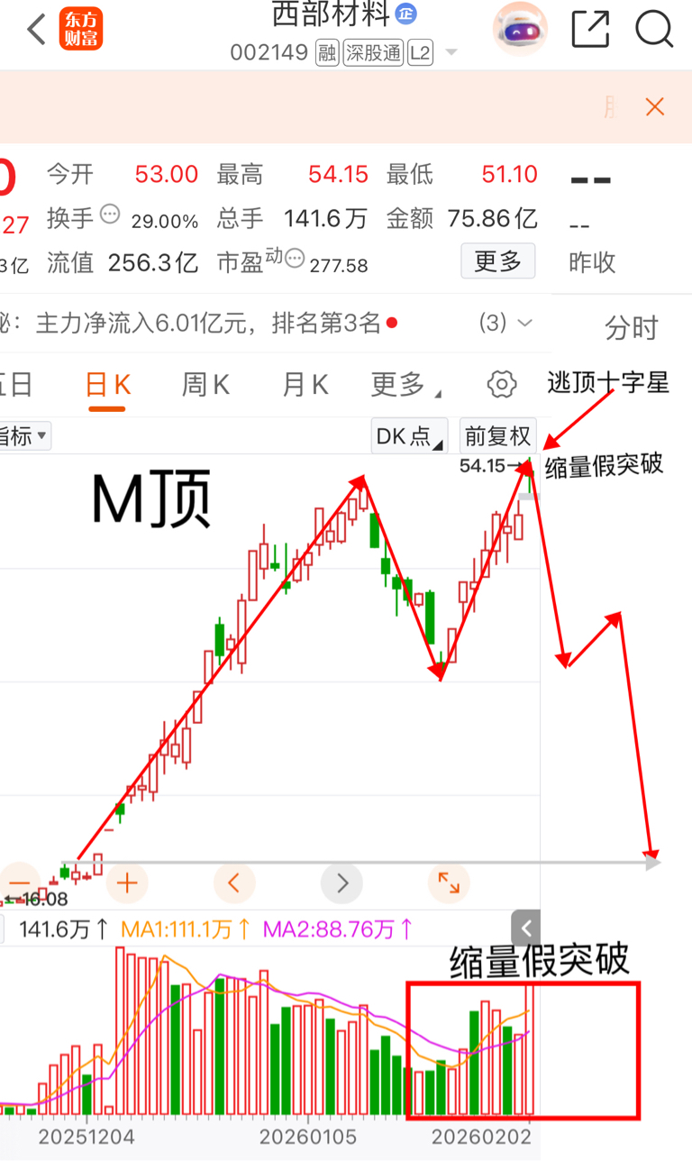 $西部材料(SZ002149)$ 快逃顶、M顶!缩量是假突破!明天乌云盖顶!