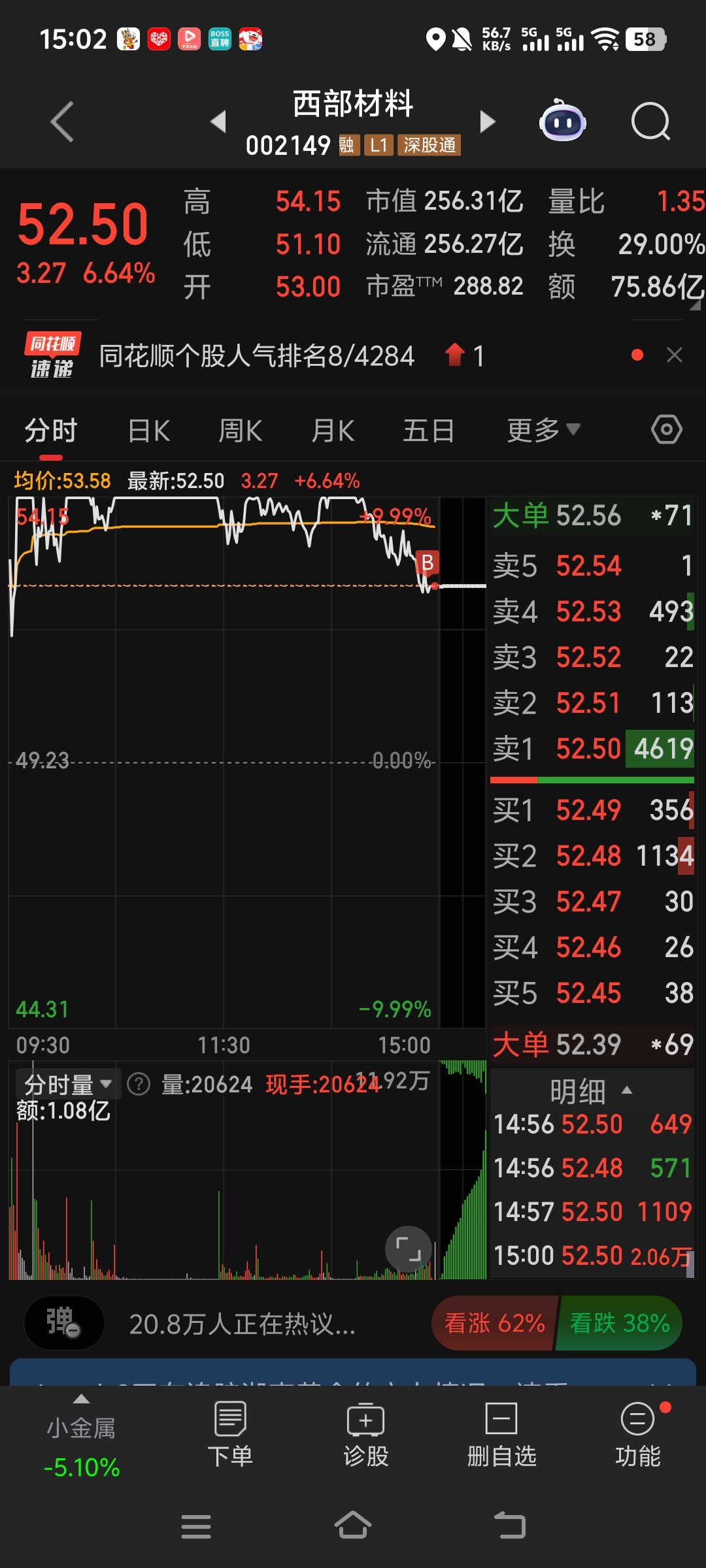$西部材料(SZ002149)$ 昨天买入40手,今天吃了6个点大肉,要不要全部出掉