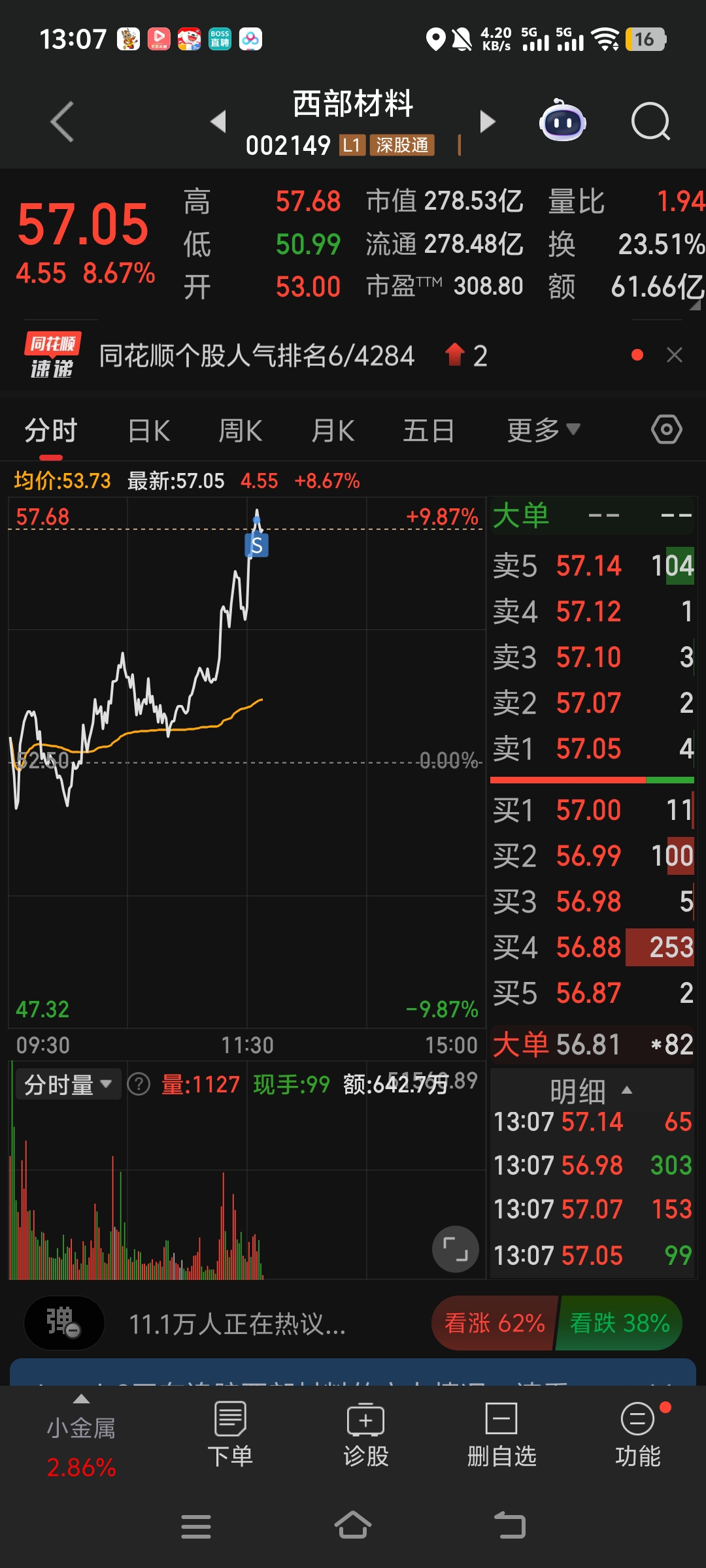 $西部材料(SZ002149)$ 昨天尾盘进,今天不封板直接卖掉不好吗,尾盘再买回来。
