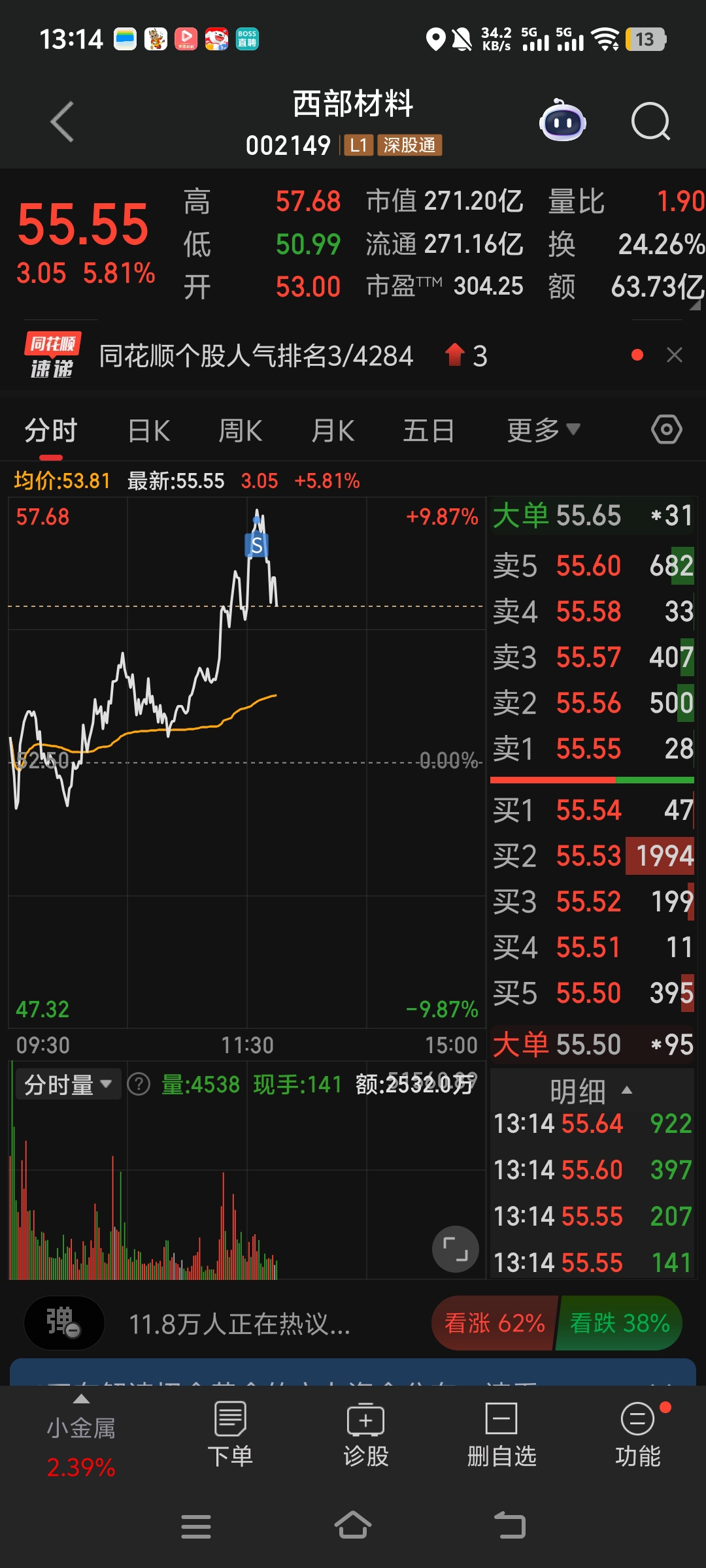 $西部材料(SZ002149)$ 拉高不封板就是诱多,今天7个点以上接盘会很惨,走势大概率是倒V。