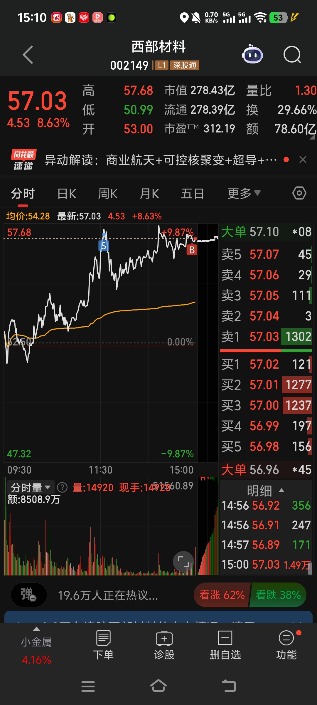 $西部材料(SZ002149)$ 这主力牛逼,我卖飞了,果断接回来,成本做到16了。