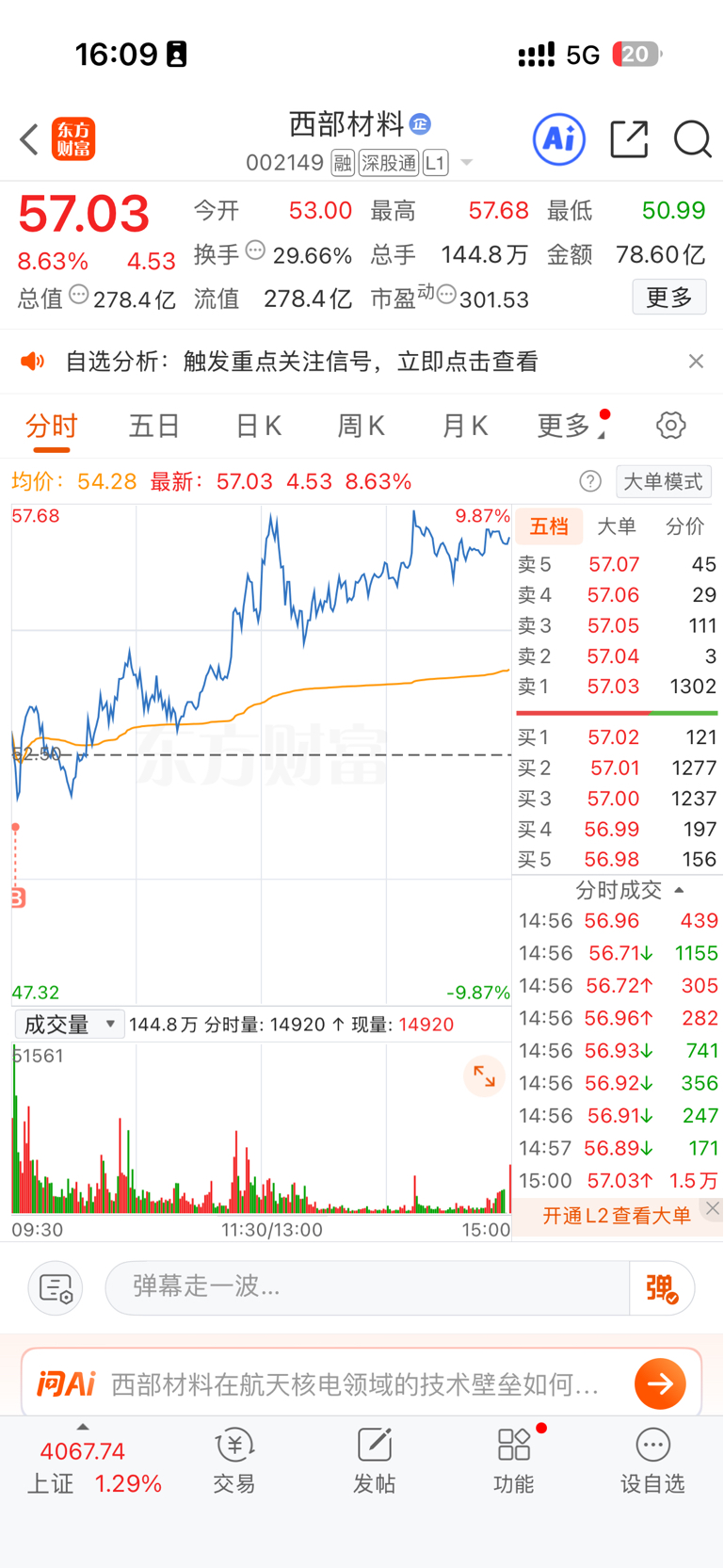 $西部材料(SZ002149)$ 作为对这只股最了解的我来说,从第一波30多到50走,37又买回,昨天涨停走,今天最低点50.99买回,我还是趋势看好它