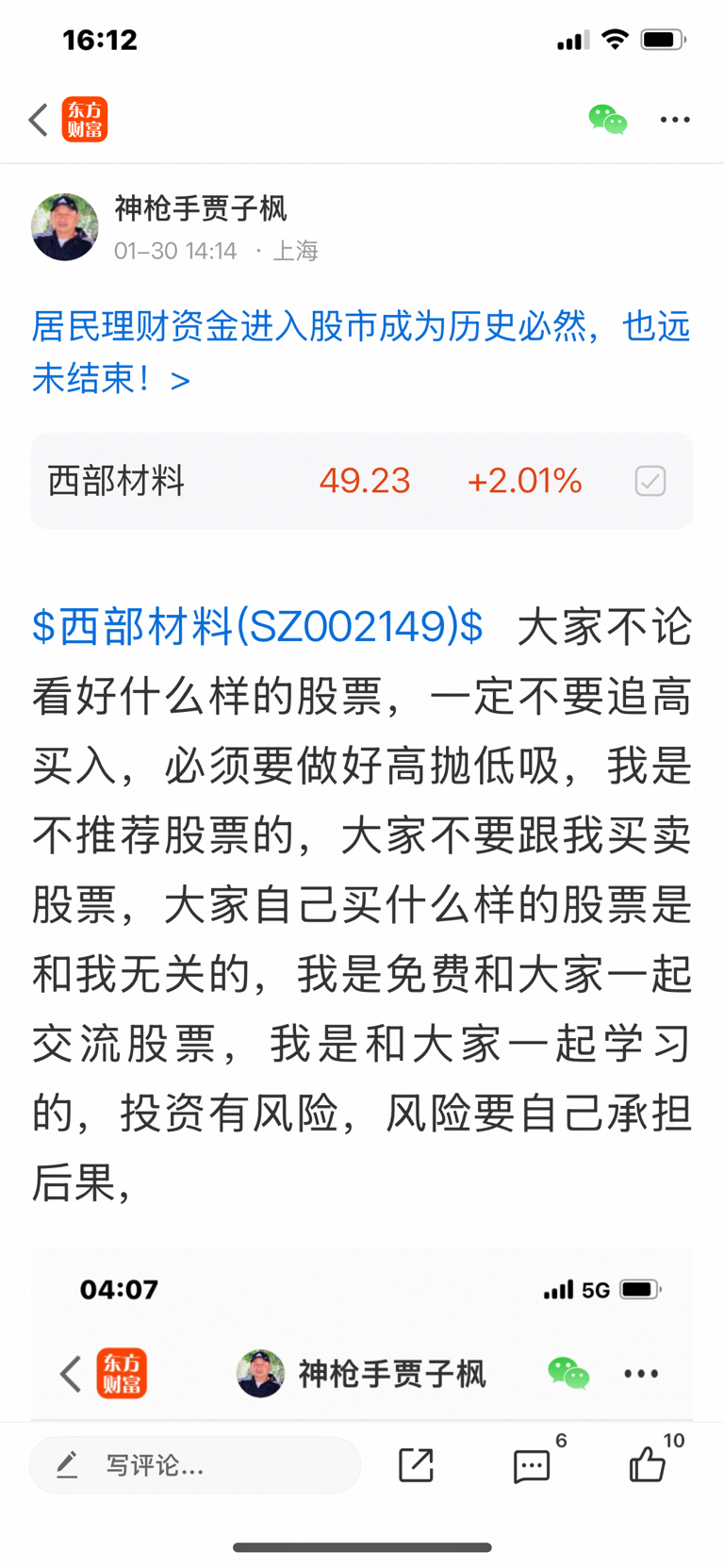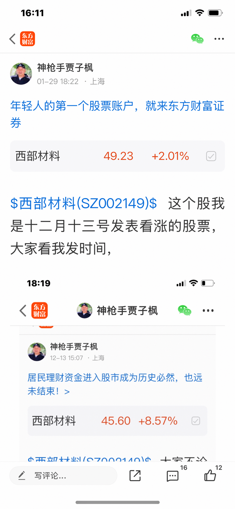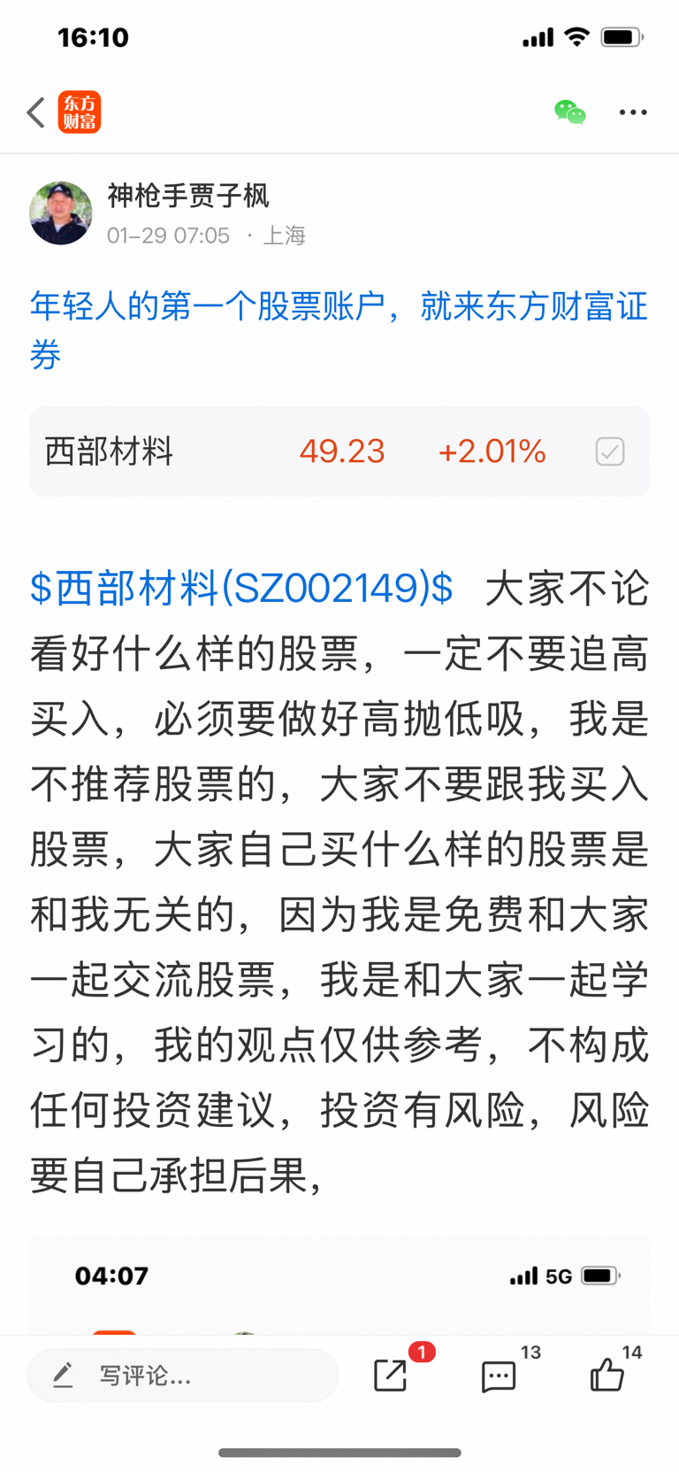 $西部材料(SZ002149)$ 这个股我是十二月十三号发表看涨的股票,大家不要追高买入,必须要做好高抛低吸,我是不推荐股票,大家不要跟我买卖股票,大家自己买什么样的股票是和我无关的,因为我是免费和大家一起交流股票,我是和大家一起学习的,我的观点仅供参考,投资有风险,风险要自己承担后果,