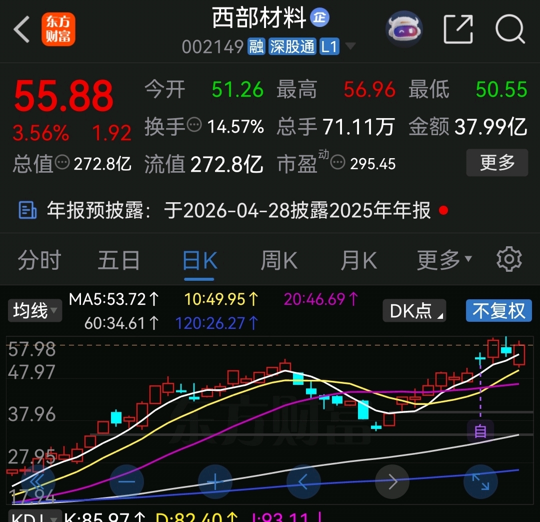 西部材料已经翻翻高度了,如他要冲击三倍高度84元左右,看看回撤42元左右支撑,现
