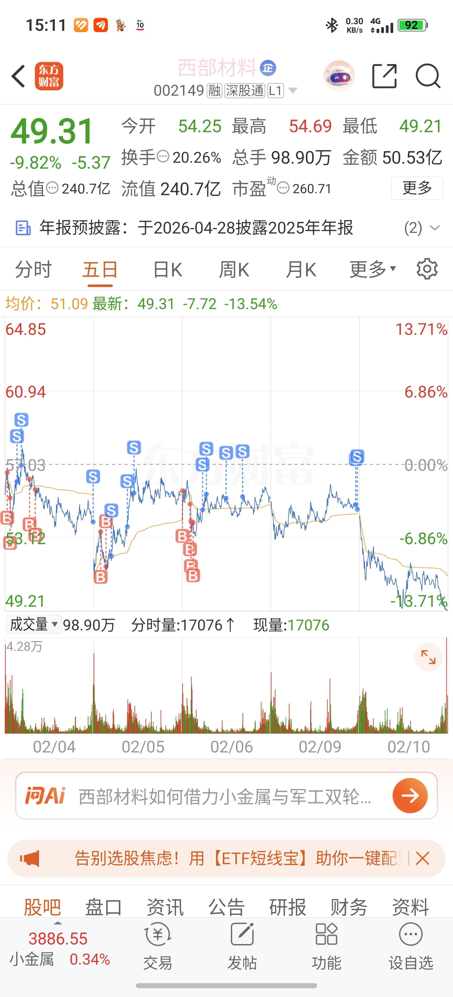 $西部材料(SZ002149)$ 窝腰烟牌,牌有问题,西西务者喂俊杰