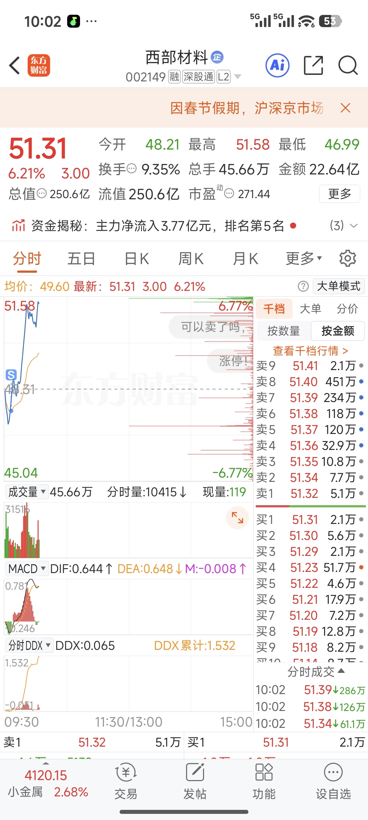 $西部材料(SZ002149)$ 昨天追高进来,你和我说一卖就拉