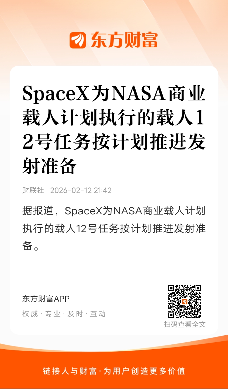 据报道,SpaceX为NASA商业载人计划执行的载人12号任务按计划推进发射准备。