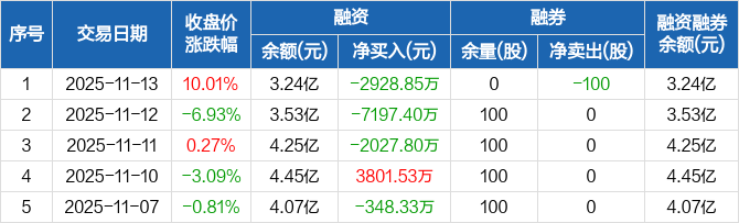融资方面,当日融资买入6864.89万元,融资偿还9793.74万元,融资净偿还2928.85万元,连续3日净偿还累计1.22亿元。融券方面,融券卖出0股,融券偿还100股,融券余量0股,融券余额0元。融资融券余额合计3.24亿元。