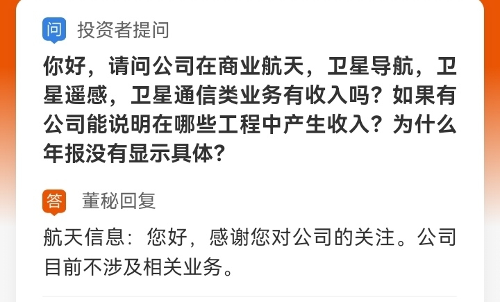 航天工程发出提示,公司主营业务不涉及商业航天。一夜之间好像都与航天板块无关了,让人摸不着头脑。