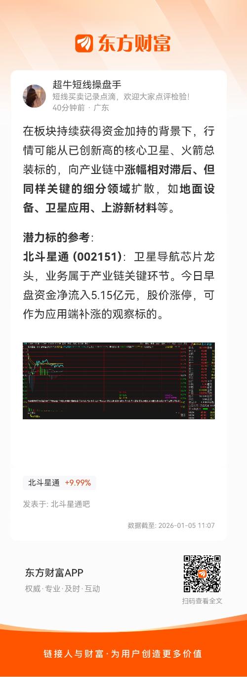 北斗星通 (002151):卫星导航芯片龙头,业务属于产业链关键环节。今日早盘资金净流入5.15亿元,股价涨停,可作为应用端补涨的观察标的。