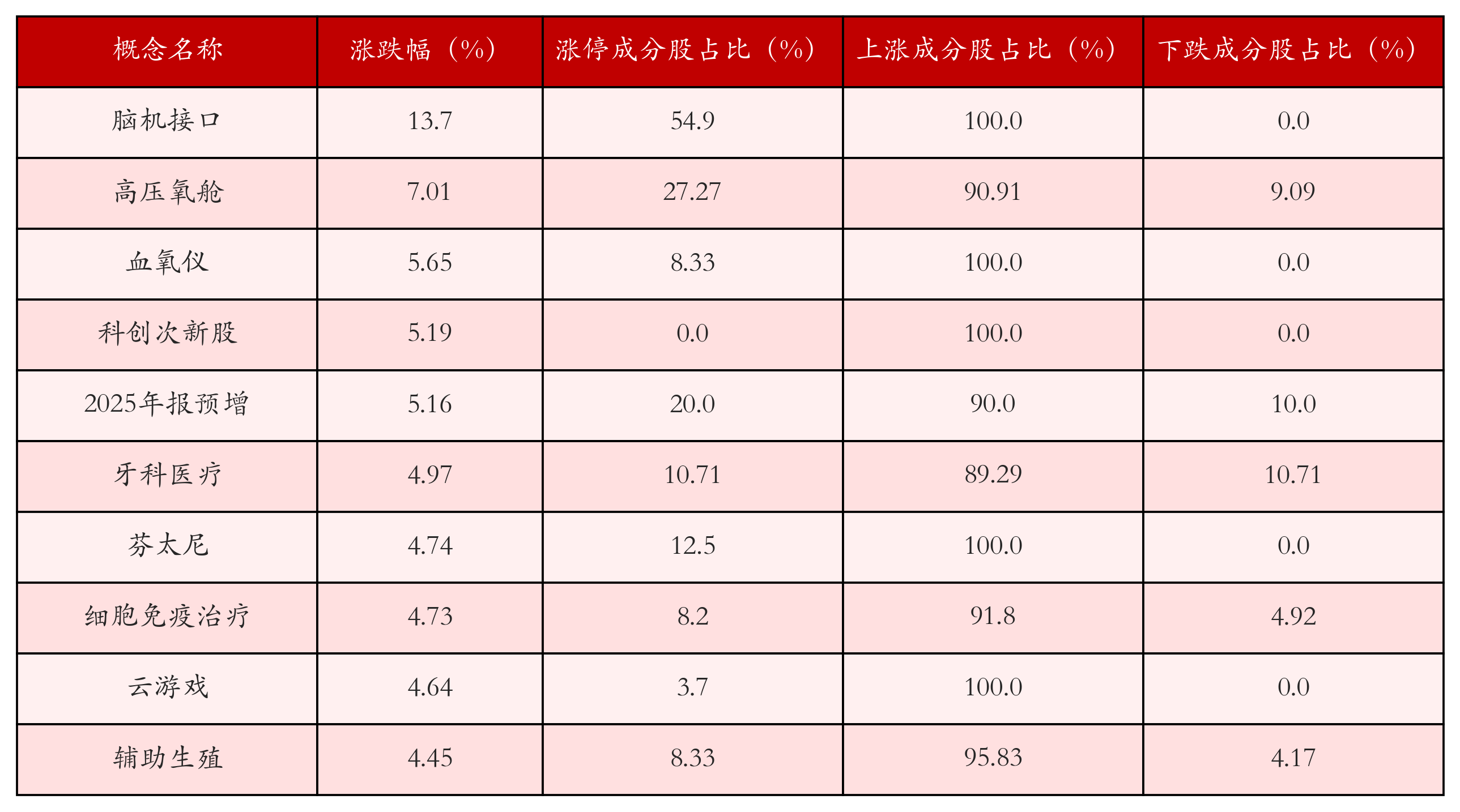 根据A股概念涨跌幅与所对应的股票池综合分析,涨幅靠前的三个概念板块分别为:脑机接口、高压氧舱与血氧仪。排名前10位的概念板块相关数据见下表: