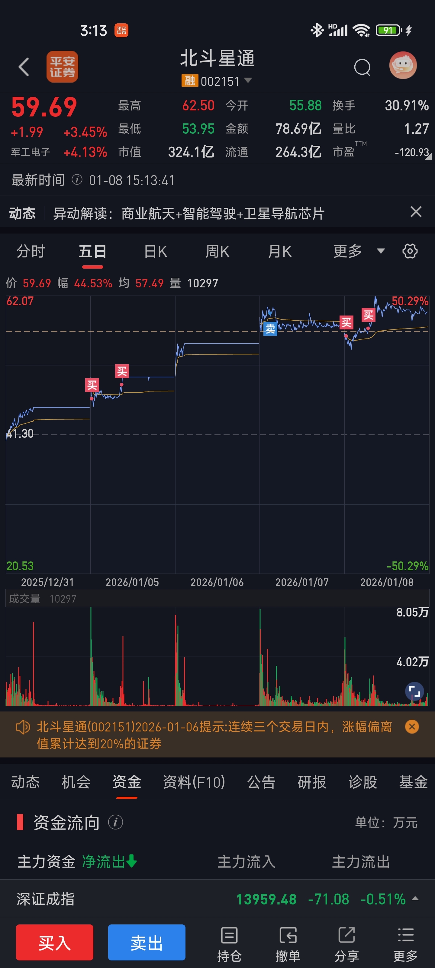 $北斗星通(SZ002151)$ 昨天九个点出完今天水下逐步加回来仓位,早盘极速下杀观察有承接,收盘基本反包昨天实体,中卫星中卫通也有修复,整体资金回流航天板块较为明显,那么明天就是观察能不能强更强封板行情,如果不能封板再减仓部分出来