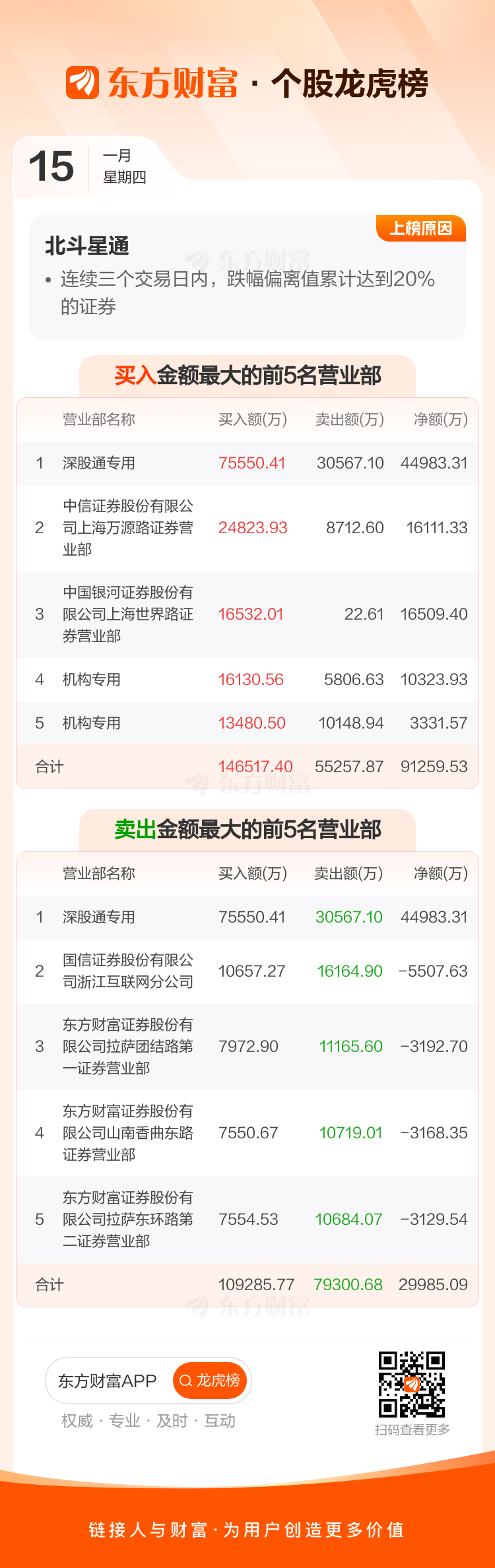 交易所2026年1月15日公布的交易公开信息显示,北斗星通因成为连续三个交易日内,跌幅偏离值累计达到20%的证券上榜。北斗星通当日收报52.33元,涨跌幅-3.50%,换手率23.42%,成交额53.79亿。异常期间1月13日至1月15日,期间涨幅-21.78%,累计偏离值-20.87%,区间成交额152.55亿。