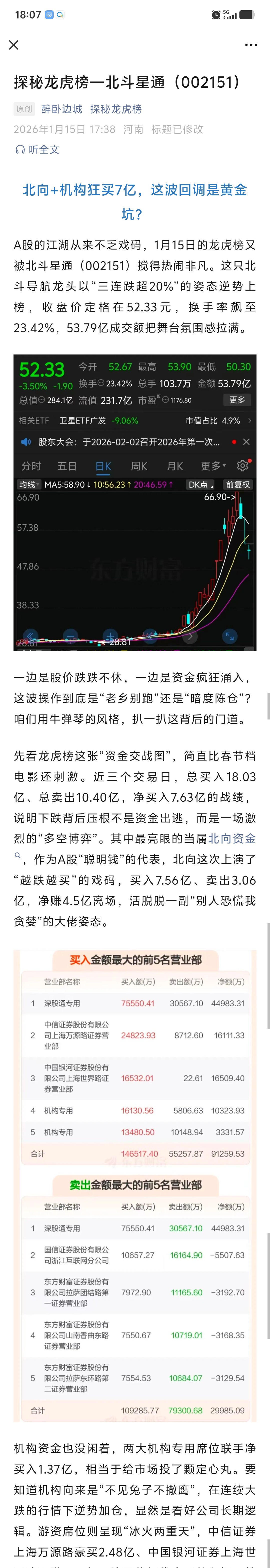 $北斗星通(SZ002151)$ 北向+机构狂买7亿,这波回调是黄金坑?A股的江湖从来不乏戏码,1月15日的龙虎榜又被北斗星通(002151)搅得热闹非凡。这只北斗导航龙头以“三连跌超20%”的姿态逆势上榜,收盘价定格在52.33元,换手率飙至23.42%,53.79亿成交额把舞台氛围感拉满