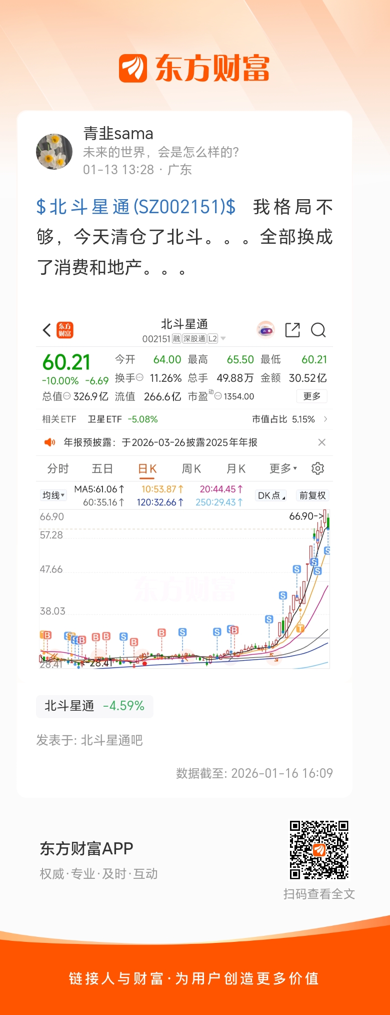 $北斗星通(SZ002151)$  我格局不够,今天清仓了北斗。。。全部换成了消费和地产。。。