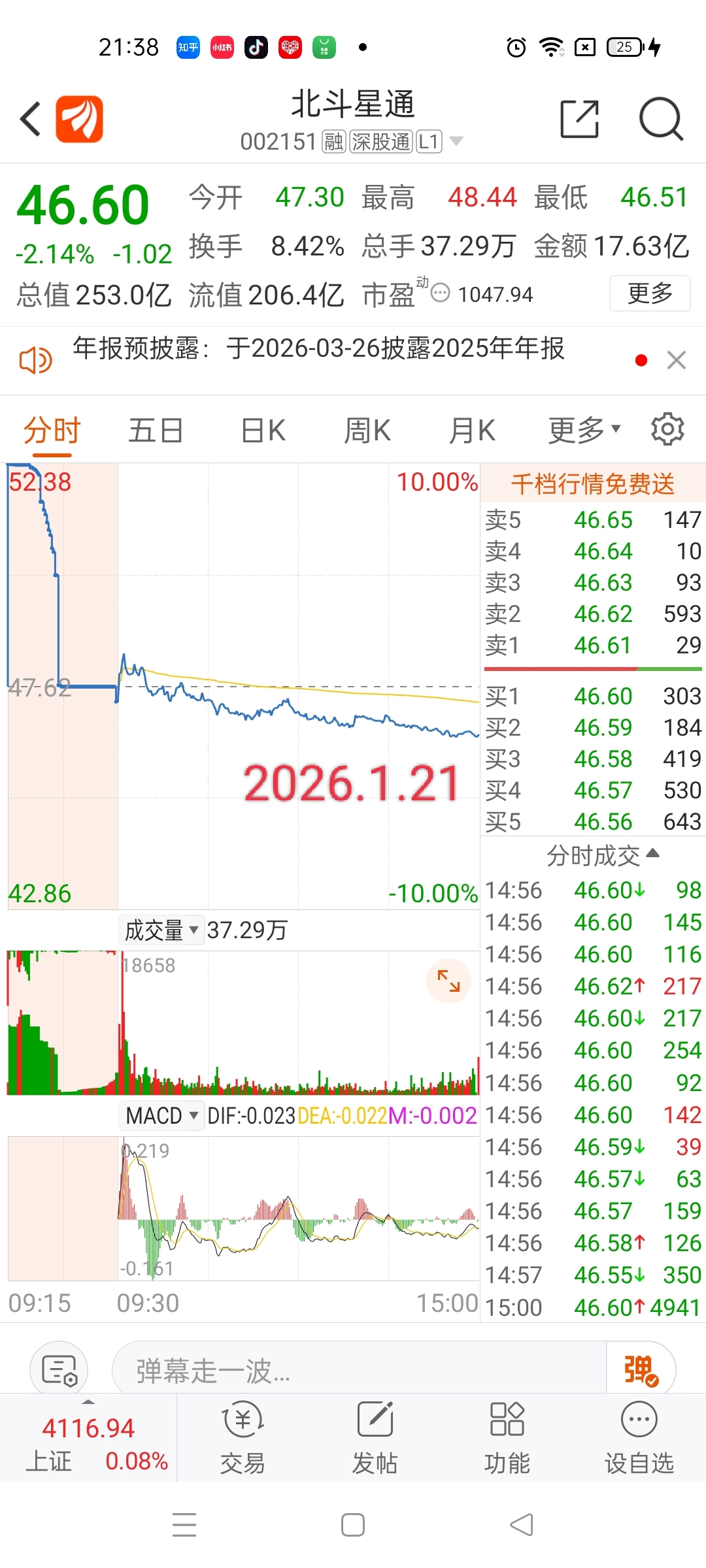 $北斗星通(SZ002151)$ 2026.1.21价格大跳水,买票减少,下跌
