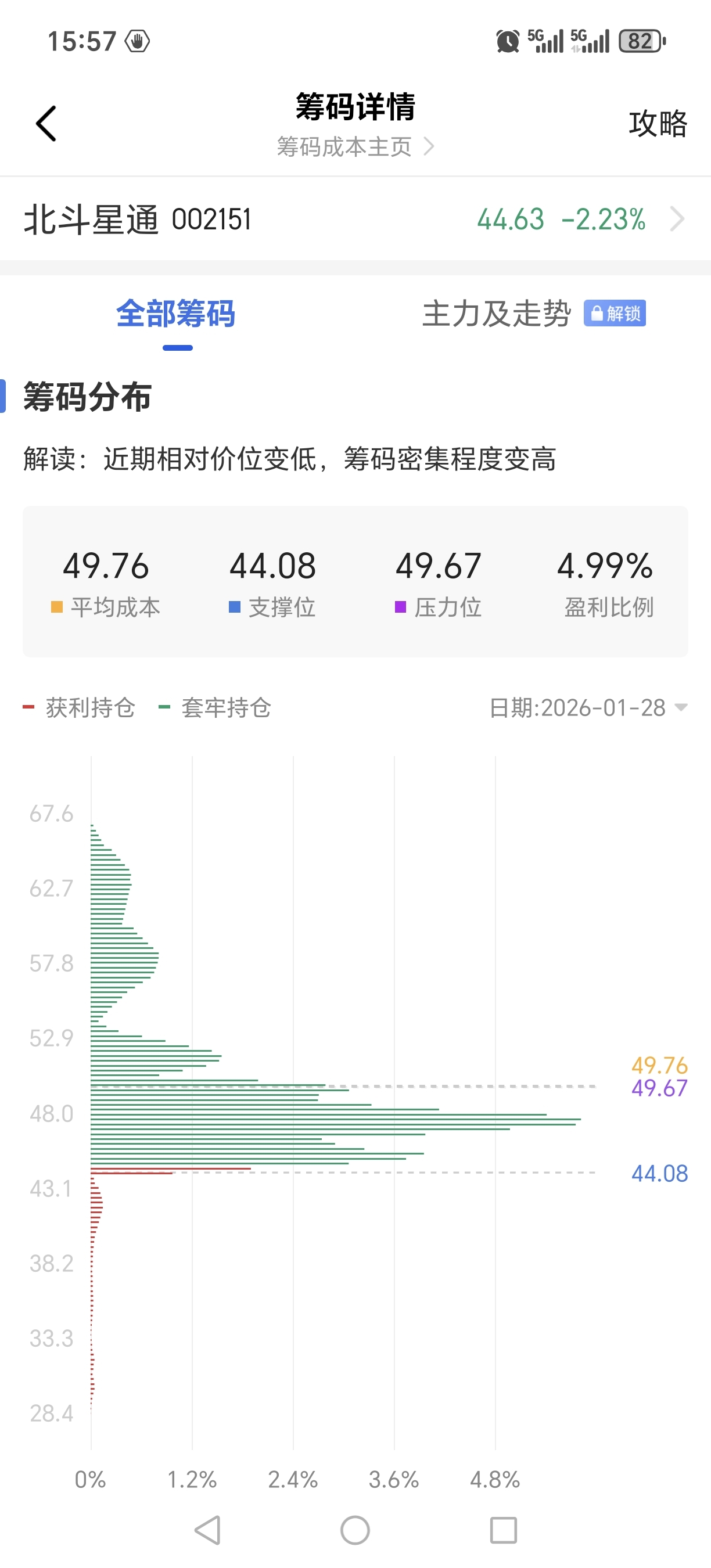 $北斗星通(SZ002151)$ 45的时候获利筹码只有3%,现在跌到44反而获利筹码变成5%了,主力真会变魔术