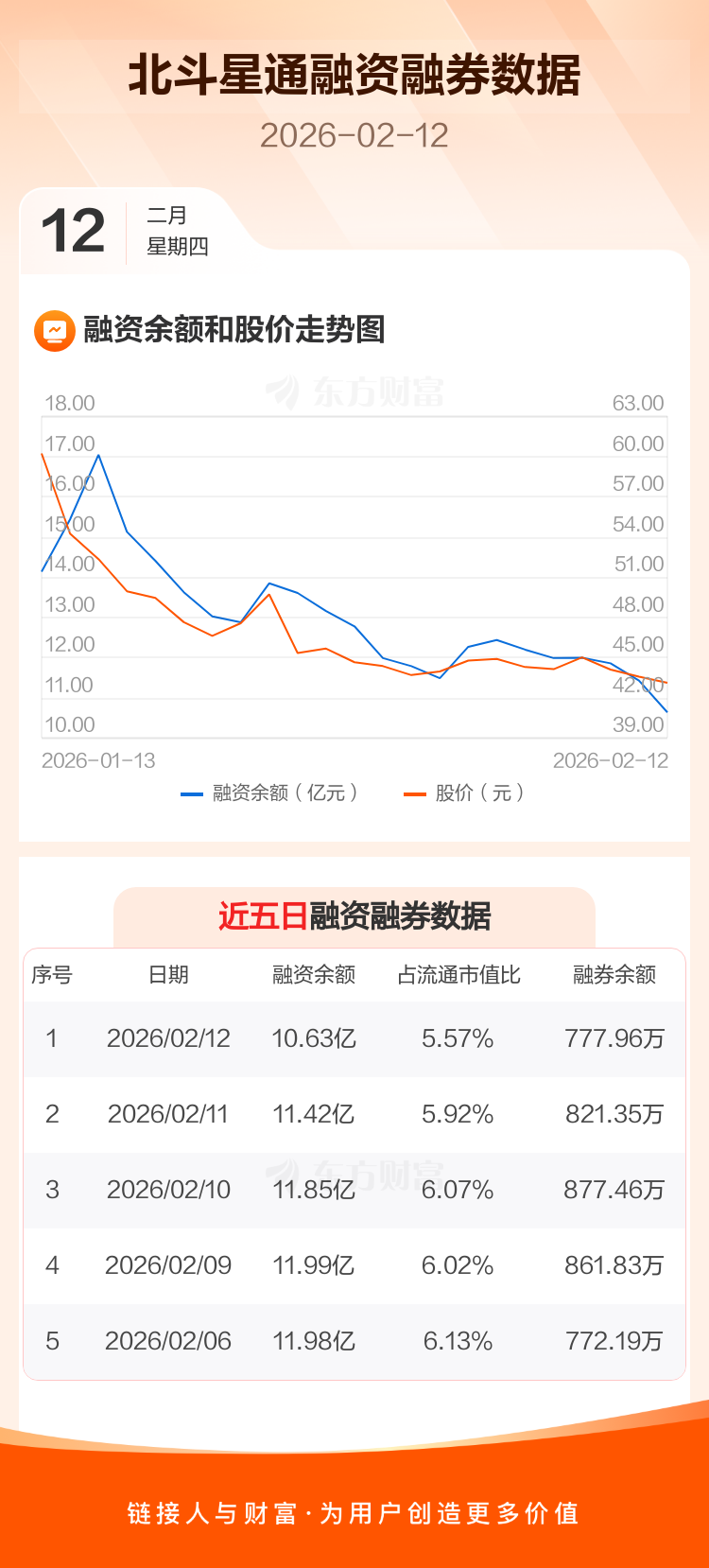 交易所最新数据显示,北斗星通于2026年2月12日获融资买入4199.99万元,融资偿还1.21亿元,当日融资净偿还7939.36万元。目前,该股融资余额10.63亿,占流通市值比例为5.57%。