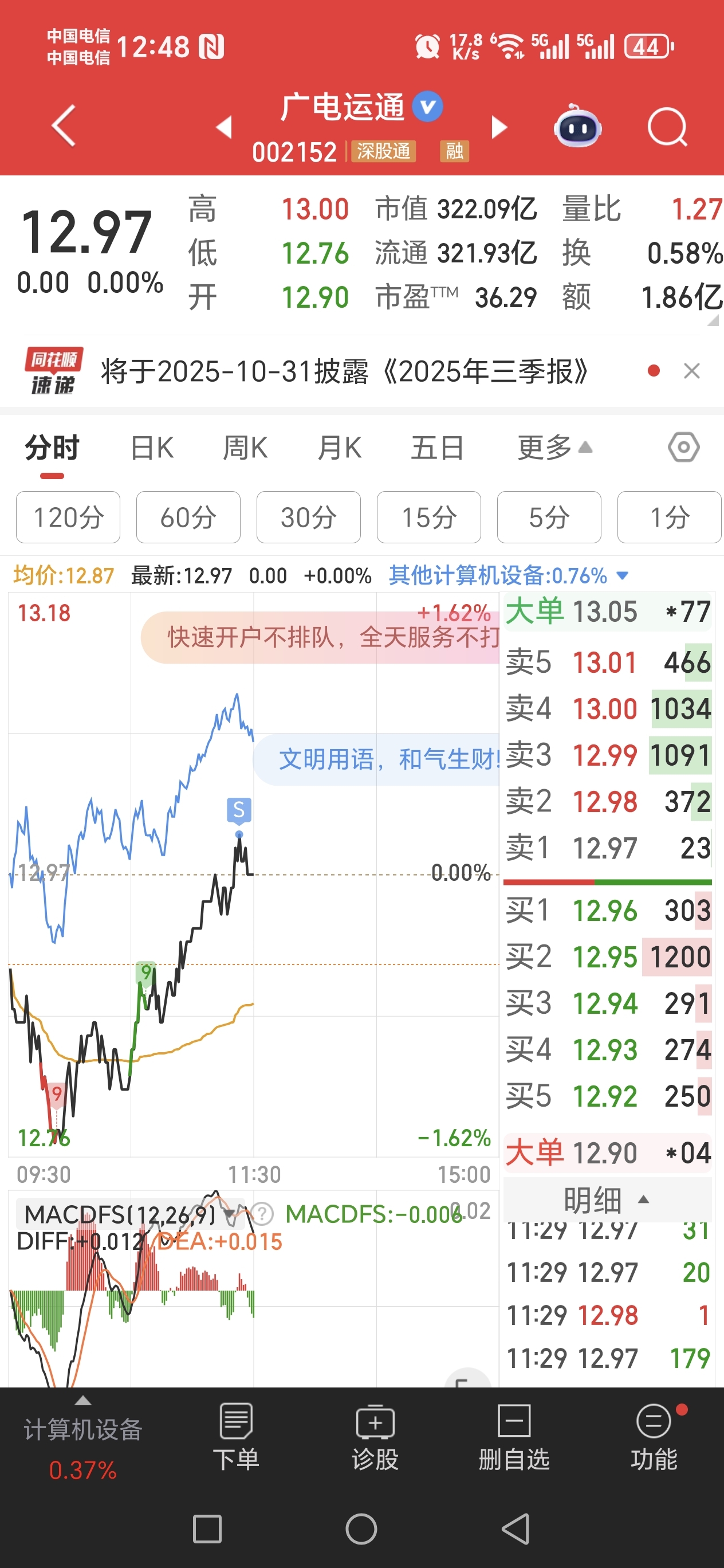 $广电运通(SZ002152)$ 13全仓出售,一会低了再接回来。可别起飞的,我就踏空了。