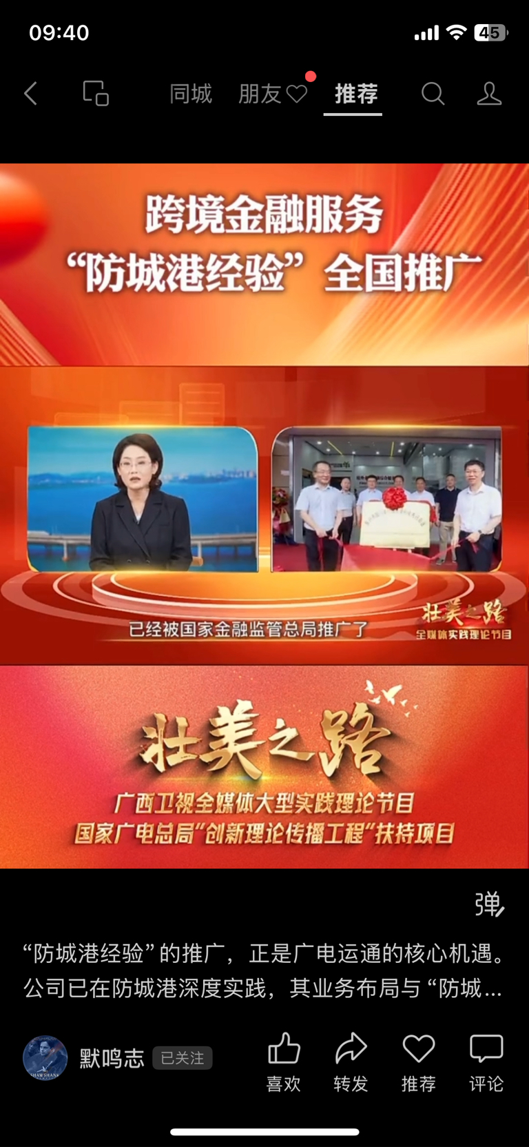 $广电运通(SZ002152)$ “防城港经验”的推广,正是广电运通的核心机遇。 公司已在防城港深度实践,其业务布局与“防城港经验”所代表的“更加便利、更加开放、更加安全、更加智慧”的跨境金融改革方向高度契合,形成了可复制的商业模式。