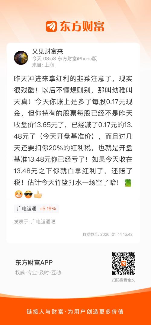 昨天冲进来拿红利的韭菜注意了,现实很残酷!以后不懂规则别,那叫幼稚叫天真!今天你账上是多了每股0.17元现金,但你持有的股票每股已经不是昨天收盘价13.65元了,已经减了0.17元的13.48元了(今天开盘基准价),而且过几天还要扣你20%的红利税,也就是开盘基准13.48元你已经亏了!如果今天收在13.48元之下你就白拿红利了,还赔了税!估计今天竹篮打水一场空了哈!