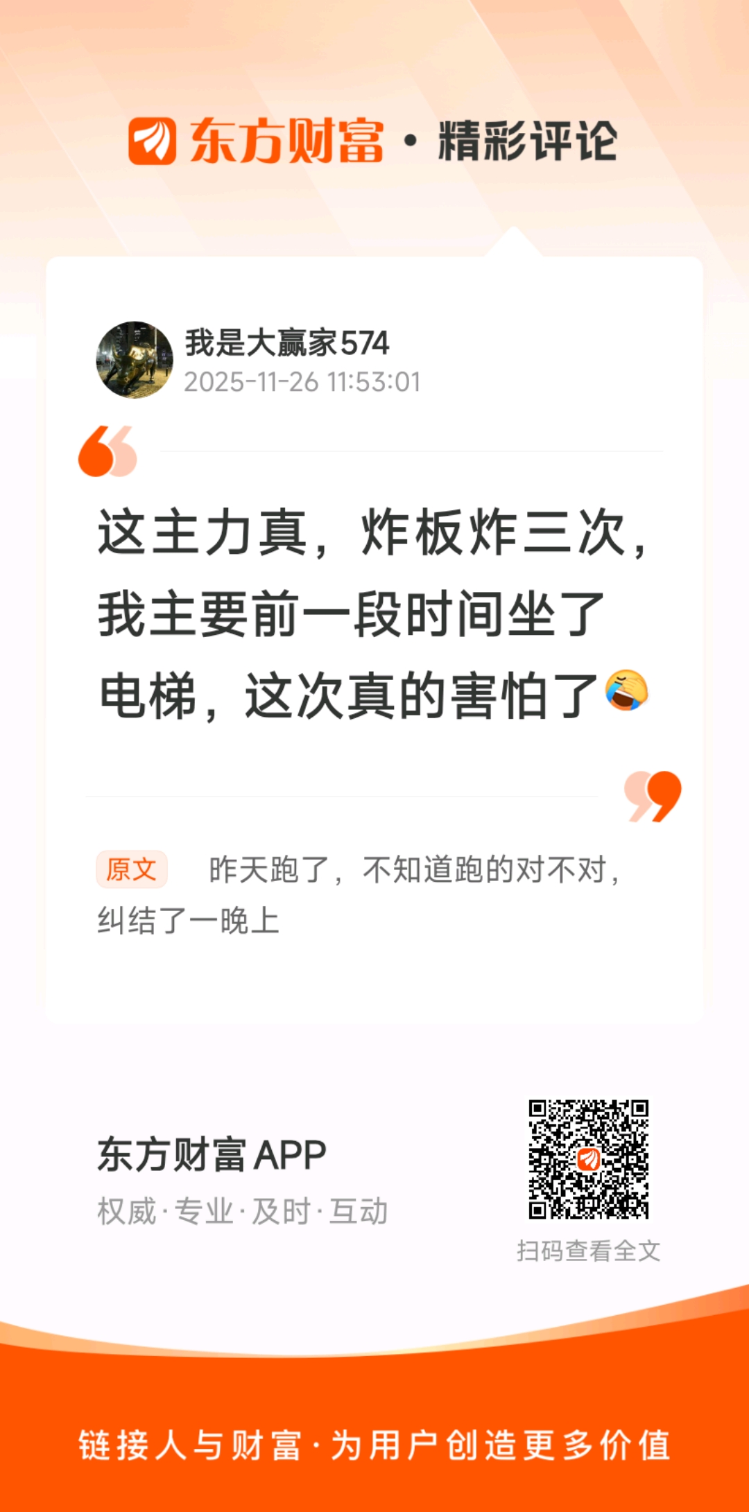 今天还有人嘲笑我吗//@我是大赢家574 :这主力真,炸板炸三次,我主要前一段时间坐了电梯,这次真的害怕了