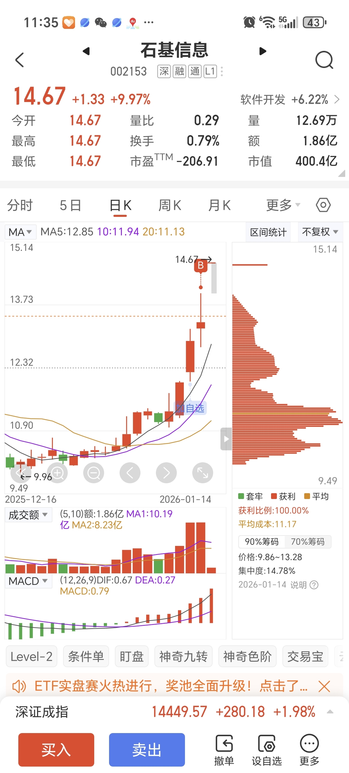 $石基信息(SZ002153)$ 昨天开进就一字,我还没加仓呢?