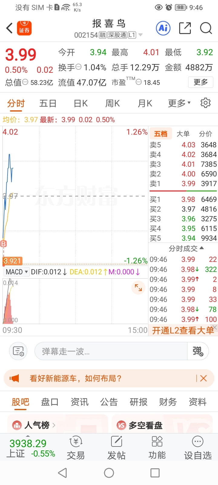 $报 喜 鸟(SZ002154)$ 昨晚挂机3.92,居然买进了
