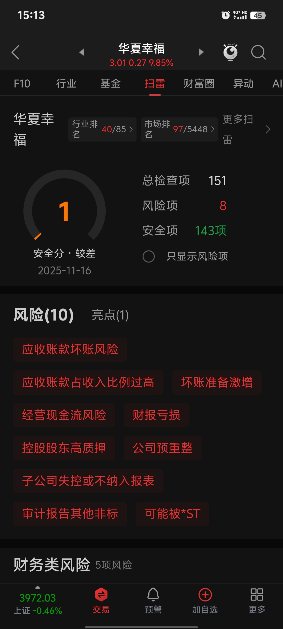 你们说这市场气人不?华夏幸福一个垃圾快要完蛋的票却连续涨停板,业绩优良的票就是不涨:看看华夏幸福的扫雷打分——