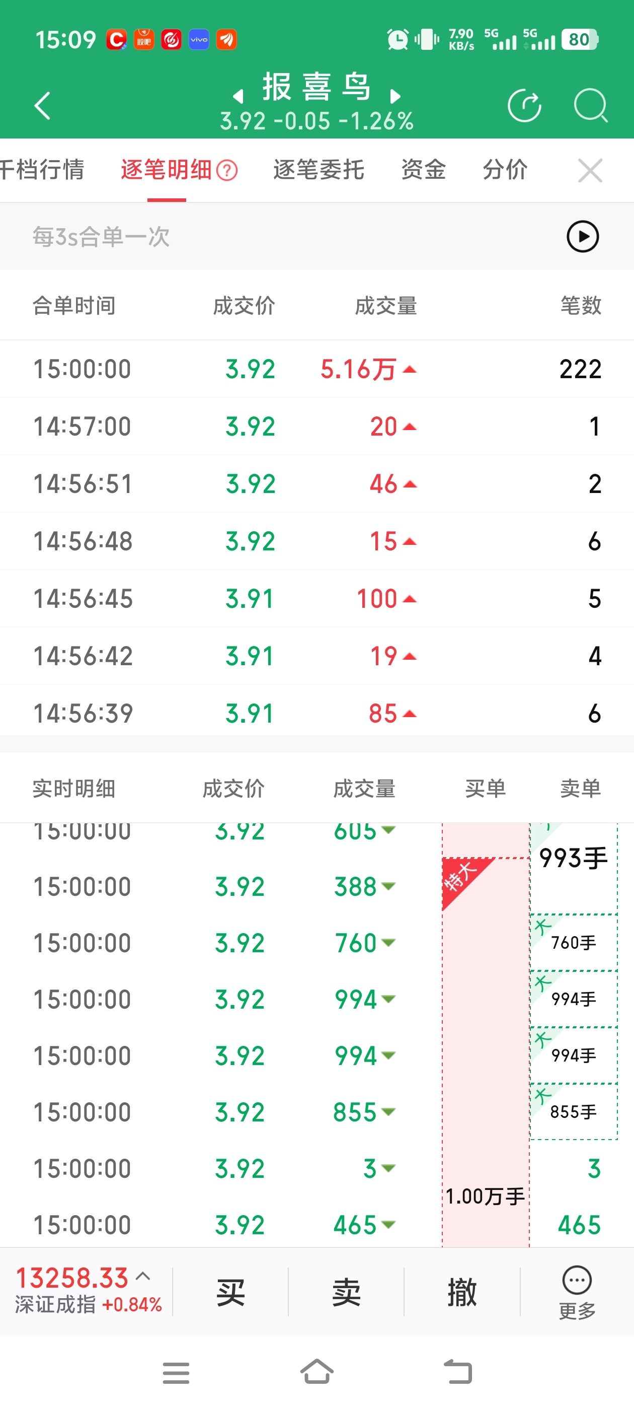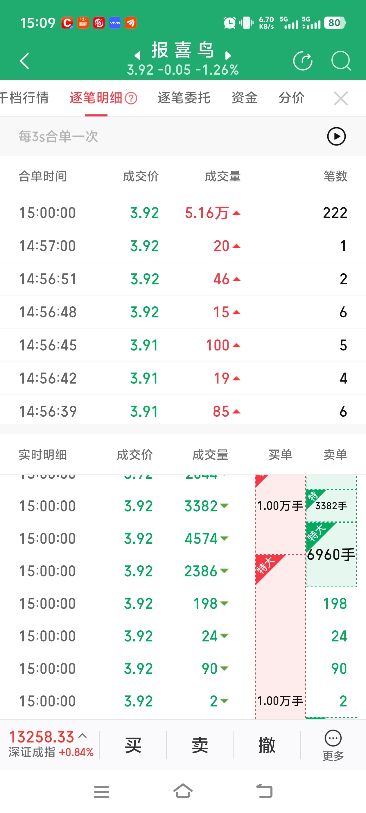 $报 喜 鸟(SZ002154)$ 尾盘5.16万手成交,有4.8万手大单抢筹买入,是什么情况,我今天才把我的5万股卖掉,下周是要起飞吗?