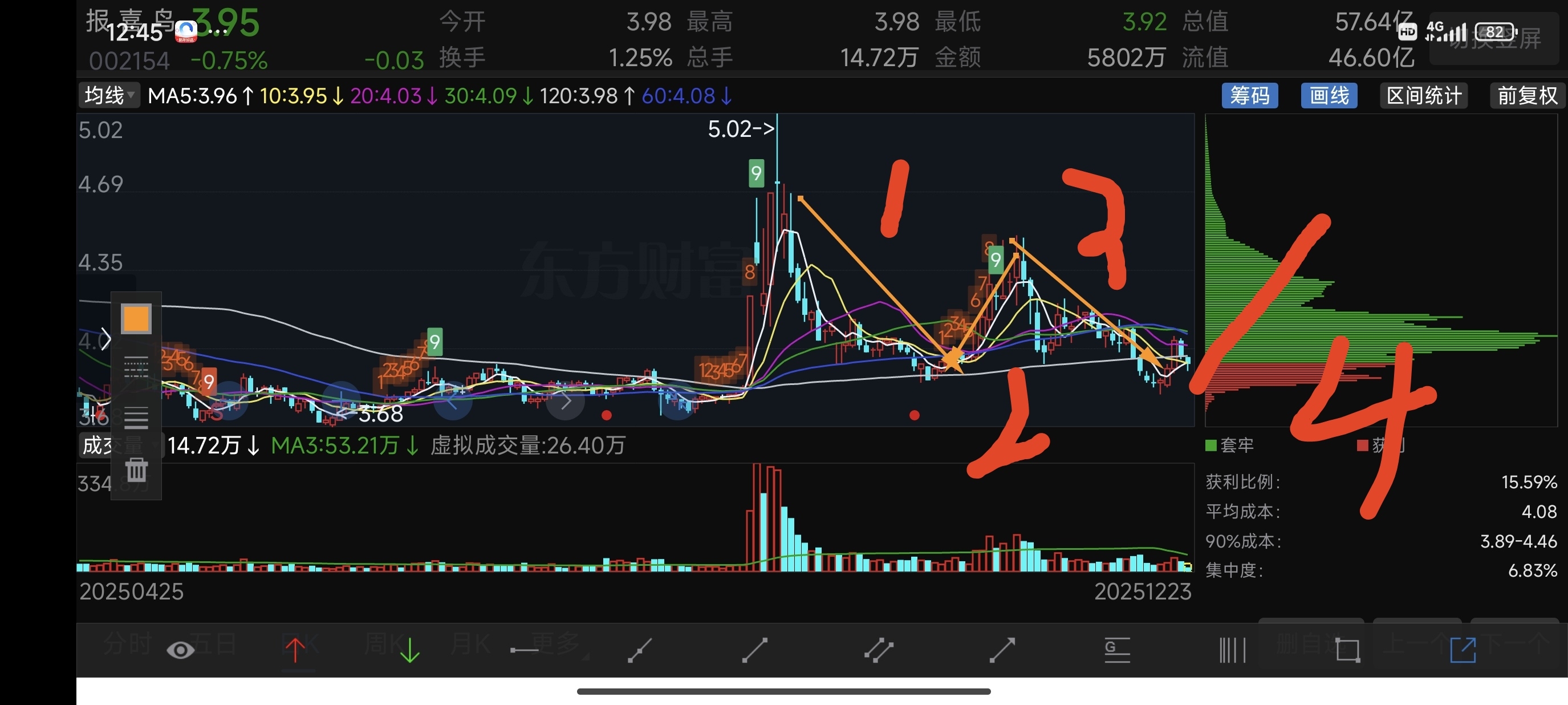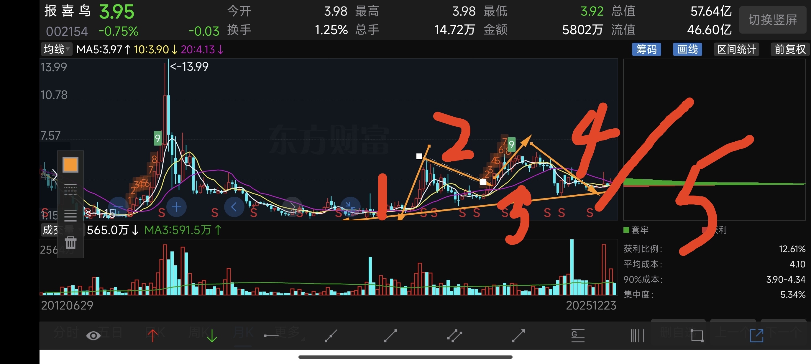 $报 喜 鸟(SZ002154)$ 下面两张图是报喜鸟的月线图和日线图。月线级别,在这里要走五浪上涨行情,月线级别时间周期比较长 估计26年以震荡上行为主。