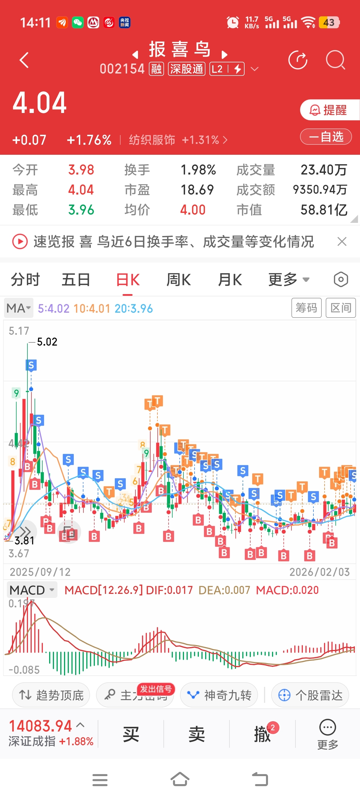 $报 喜 鸟(SZ002154)$ 一路跌跌撞撞,还赚5个点,成本t到了3.86
