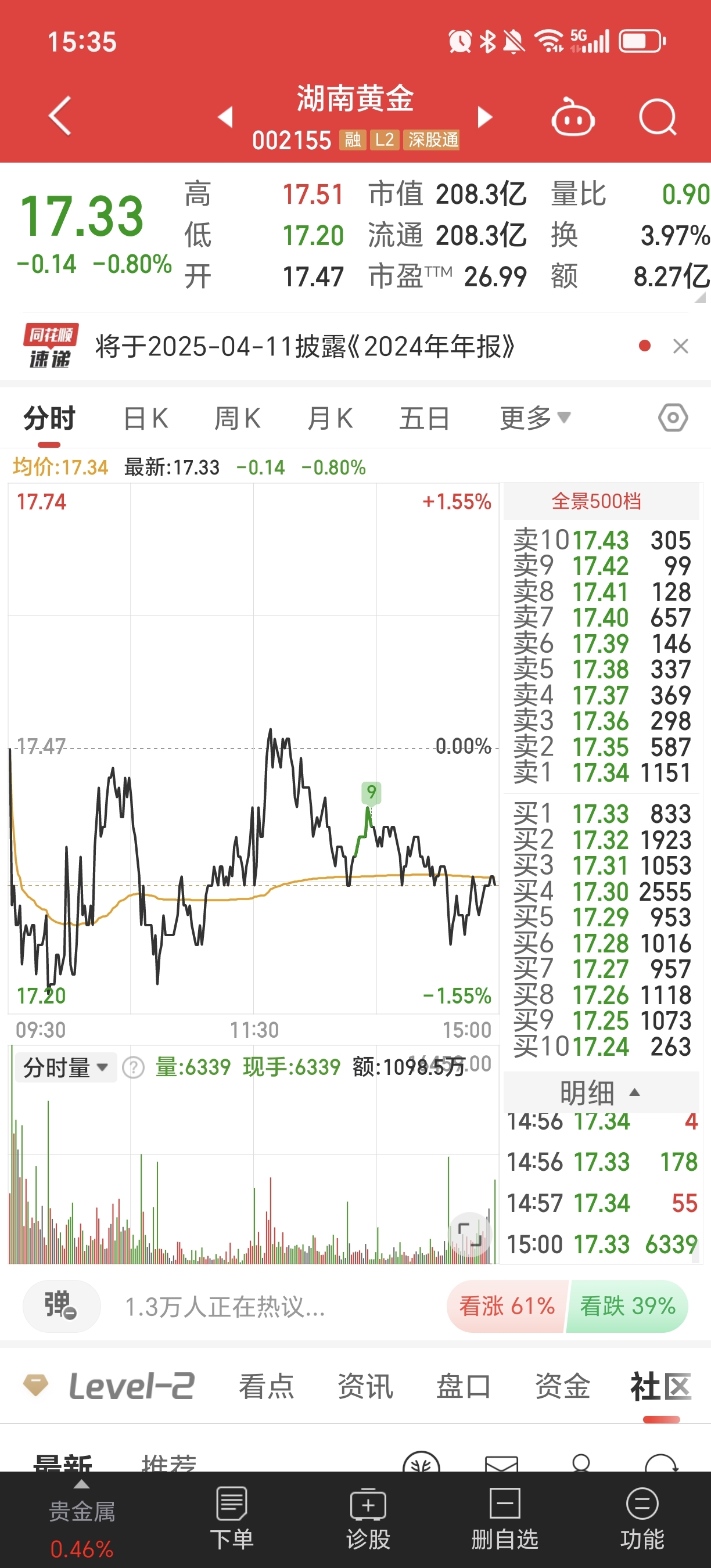 $湖南黄金(SZ002155)$ 今天我的湖南黄金没有任何操作,一直在等待主力资金选择多空方向!!!