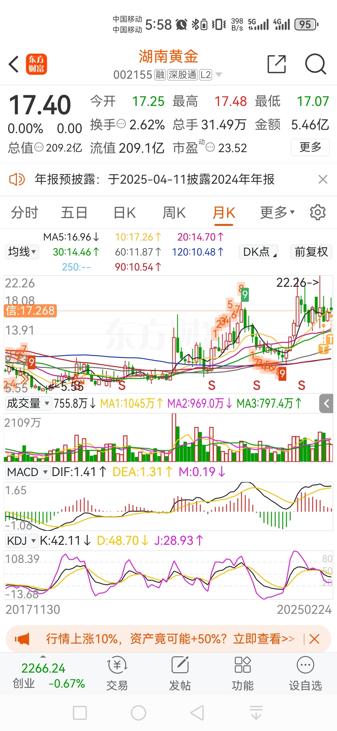 $湖南黄金(SZ002155)$ 看看月线,价格还低吗?底部上来涨了多少看不见吗?
