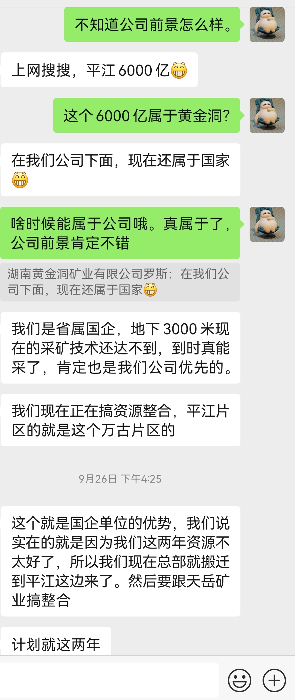 $湖南黄金(SZ002155)$ 各位韭菜们,万古暂时就别想了,这是我应聘湖南黄金洞,跟黄金洞公司的人对话。这票没有救了,只能做T。