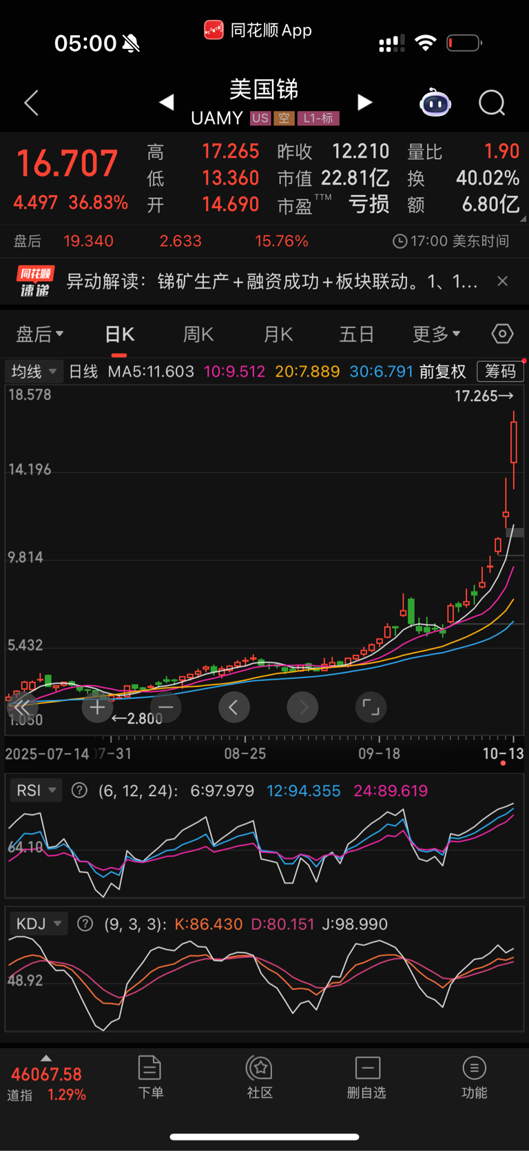 $湖南黄金(SZ002155)$ 美国锑也太炸裂了,盘后还涨16%$华钰矿业(SH601020)$