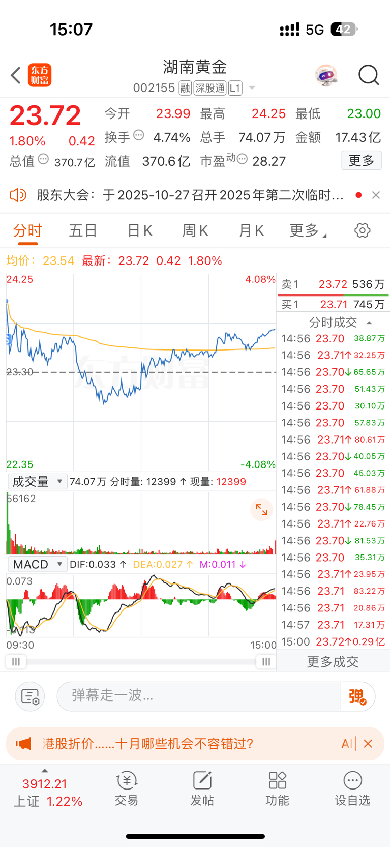 $湖南黄金(SZ002155)$ 今天早上24卖了挂单23没成交可惜了