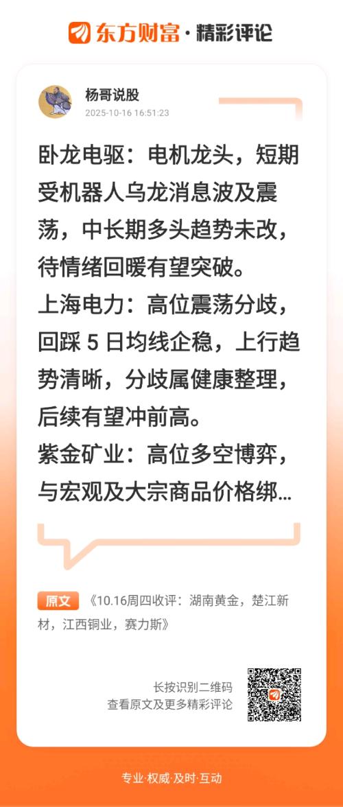$湖南黄金(SZ002155)$$天下秀(SH600556)$$赛力斯(SH601127)$//@杨哥说股 :卧龙电驱:电机龙头,短期受机器人乌龙消息波及震荡,中长期多头趋势未改,待情绪回暖有望突破。上海电力:高位震荡分歧,回踩 5 日均线企稳,上行趋势清晰,分歧属健康整理,后续有望冲前高。紫金矿业:高位多空博弈,与宏观及大宗商品价格绑定,非趋势反转,板块回暖后有望凝聚上行动能。二、指数与盘面指数:冲高回落后守住 5 日均线,企稳信号明确,调整消化获利盘,后续大概率重拾震荡上行。板块:保险、银行、煤炭等价值板块领涨,港口航运午后走强;筹码向低估值迁移,重点关注价值板块持续性。三、持有股复盘个股 核心情况 操作策略天下秀:低开震荡,站稳 5 日线,上升趋势未变,继续格局赛力斯:区间震荡,筹码锁定好,业绩与销量有支撑 高抛低吸 + 格局江西铜业:高位震荡,受铜价与宏观影响,短线高抛低吸 + 格局北方稀土:未守住支撑位,抛压大承接弱,暂行止损湖南黄金 受大势影响下行,企稳 5 日线,黄金行情支撑,继续格局楚江新材 三天二板,炸板后回封,强势明确,继续格局合肥城建 5 天 4 板,炸板回封,人气与动能充足,继续格局