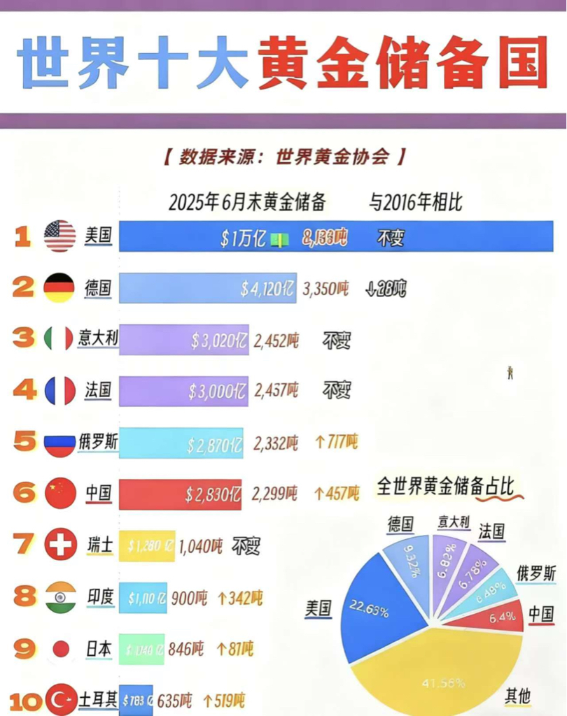 $湖南黄金(SZ002155)$ 前10央行黄金持有量(2025年6月)