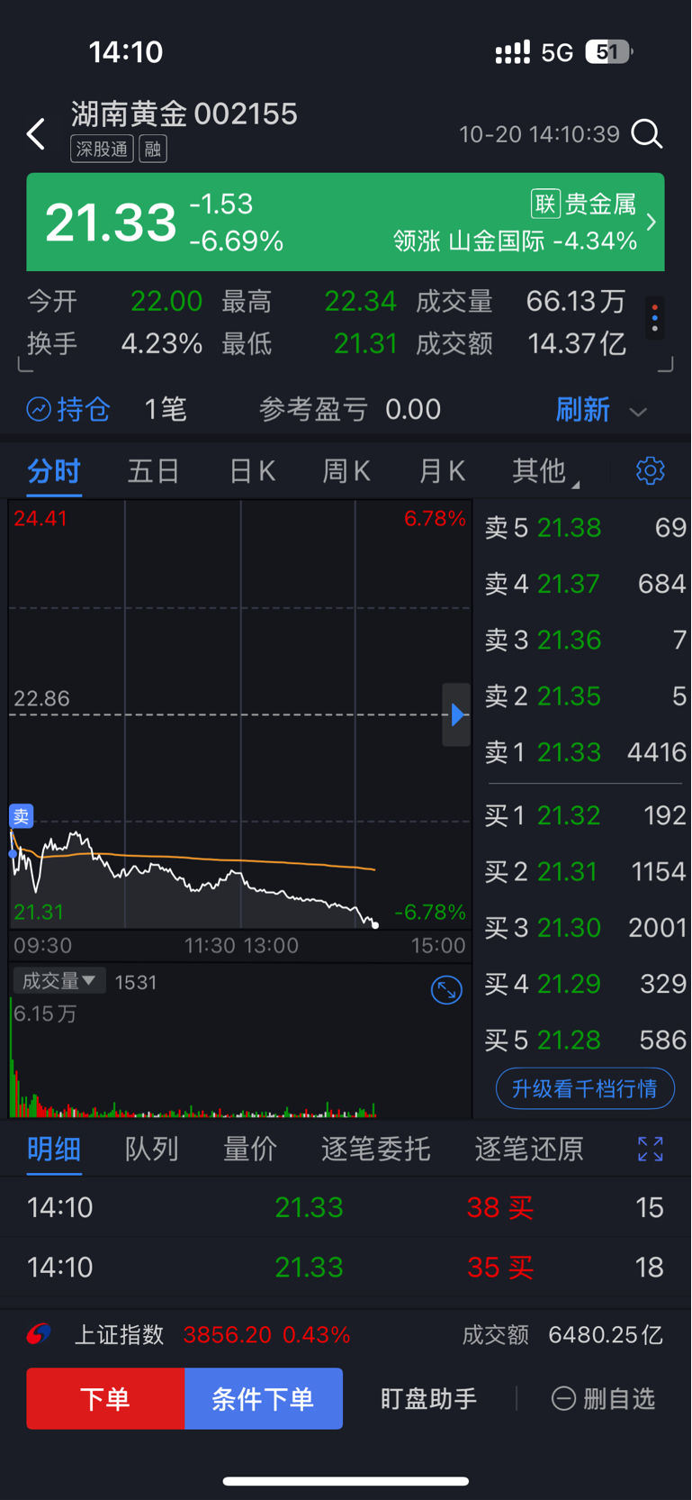 $湖南黄金(SZ002155)$ 今天跑完了,管你怎么跌